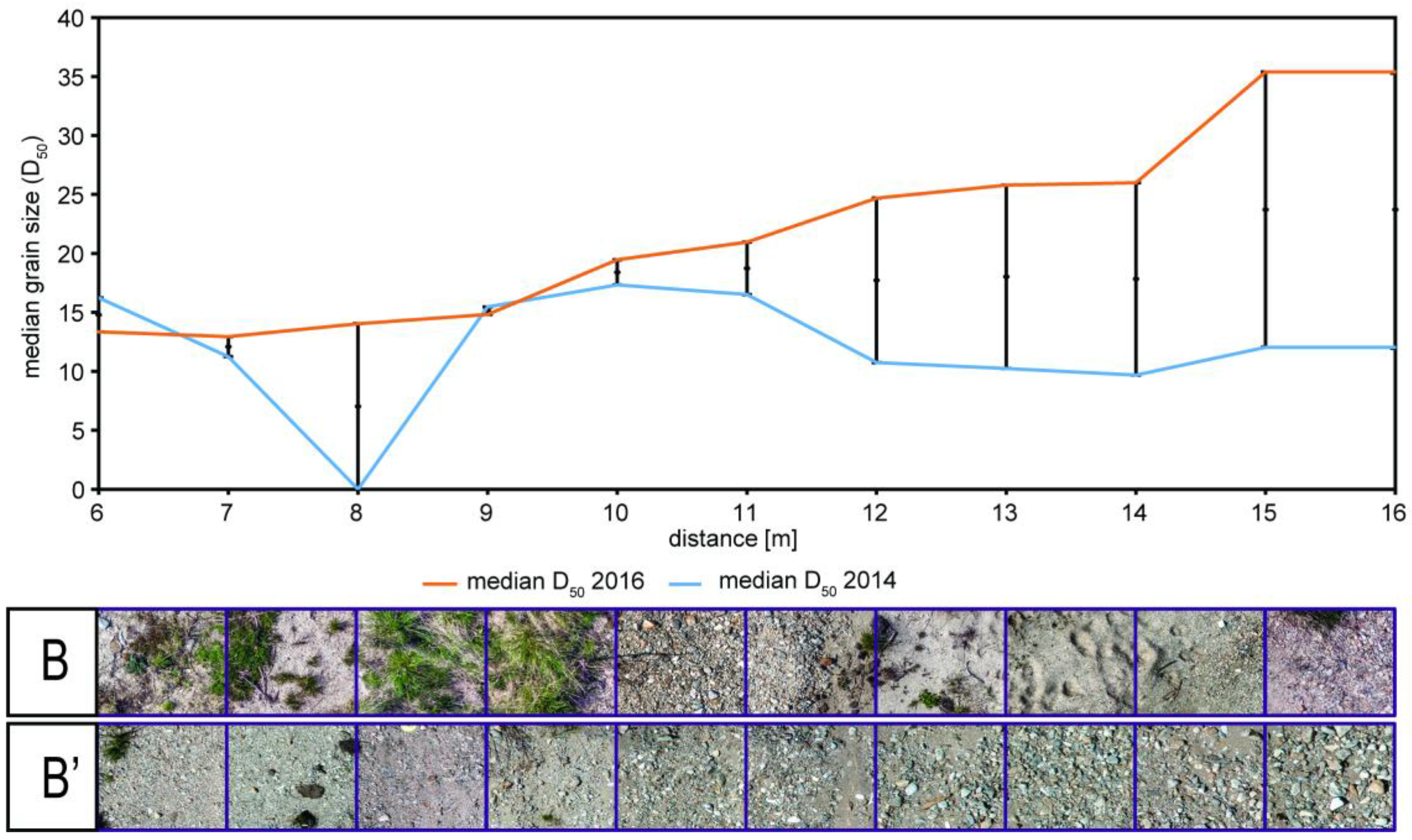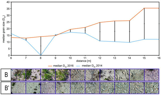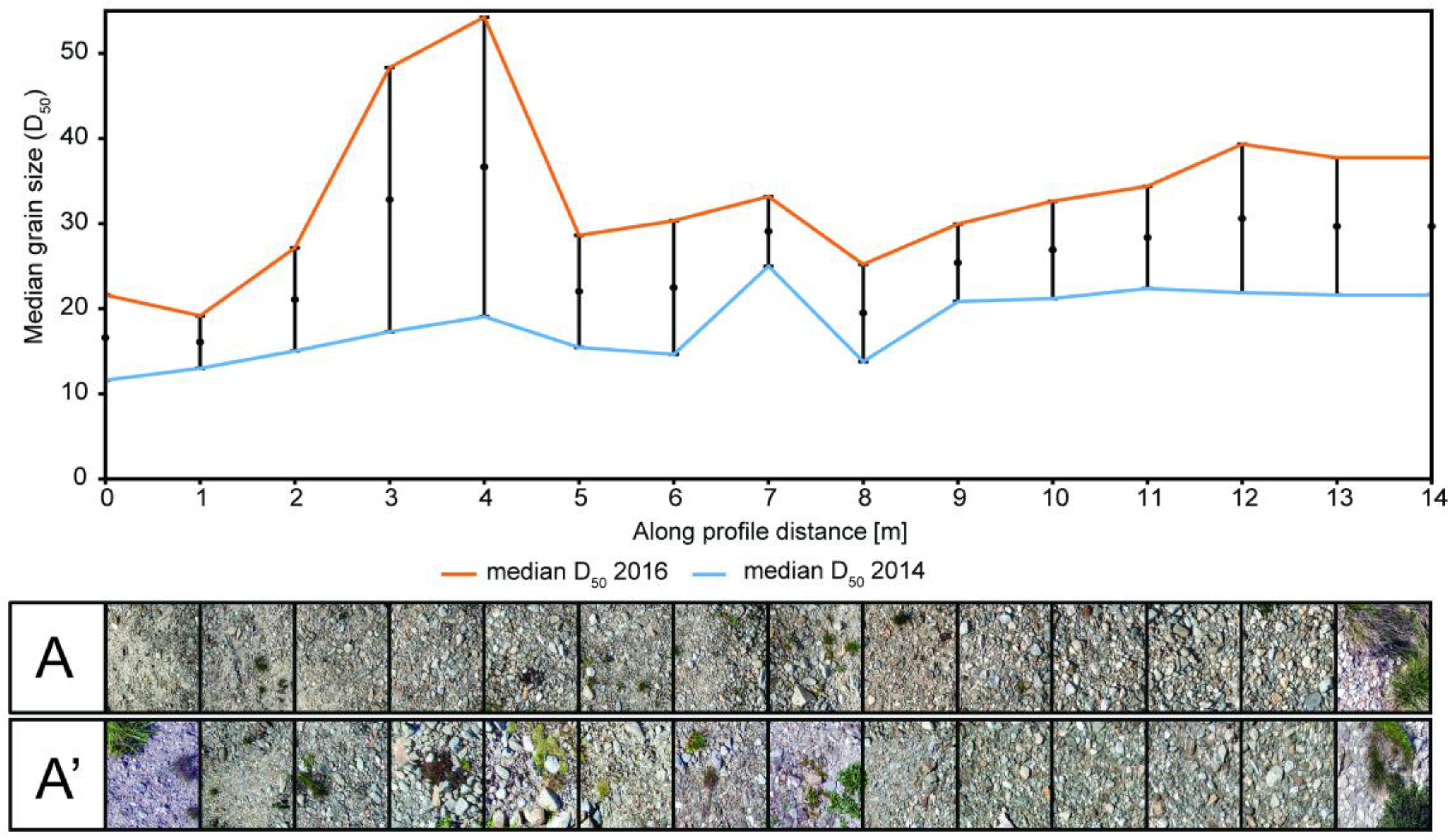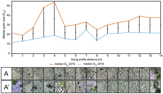 In order to visualize multitemporal changes in grain size distribution, we used BaseGrain to calculate a simple linear regression of the median diameter D50 of all transects (Figure 11 and Figure 12). Here, the median grain size is used because it is one of the most important parameters characterizing the effective particle size of a group of particles or of the grain size distribution curve, and therefore can be used to reasonably visualize grain size variability across the point bar. The median diameter D50 corresponds to the 50th percentile on a cumulative curve dividing its distribution into two equal parts, where 50% of the particles are larger and 50% are smaller than the typical value of D50. The estimated median D50 obtained from photo-sieving, applied to transects A (blue line) and A’ (orange line), shows significant differences in the grain size distribution of coarser grains between these two years (Figure 11). Additionally, the differences in the median D50 values are plotted by subtracting the median D50 values of the 2016 photo-sieved grid fields from their corresponding values from the 2014 photo-sieved grid fields, representing the midpoints by point markers (Figure 11 and Figure 12). One error bar was plotting for each grid field (Figure 11 and Figure 12). A positive value indicates that, during these two years, the photo-sieved area became coarser, whereas a negative value indicates that the photo-sieved area became finer.