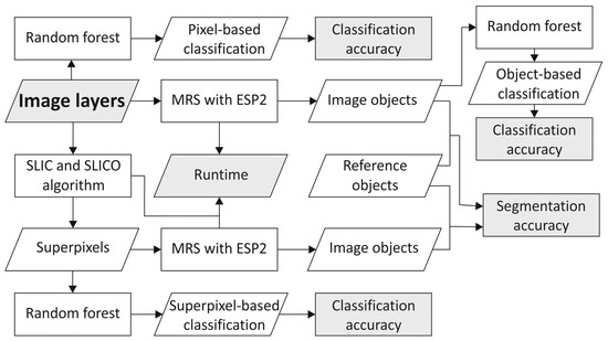 Proposed workflow to partition a scene into objects starting from pixels and superpixel level, respectively, by applying Estimation of Scale Parameter 2 (ESP2) [6], an automated parameterization tool for multiresolution segmentation (MRS) [14]. The computational time is retained for both cases. Resulted objects were geometrically compared with the reference objects and segmentation accuracy measures were derived. For the classification scenarios, the final accuracies were compared between pixel-based, object-based and superpixel-based classification.
