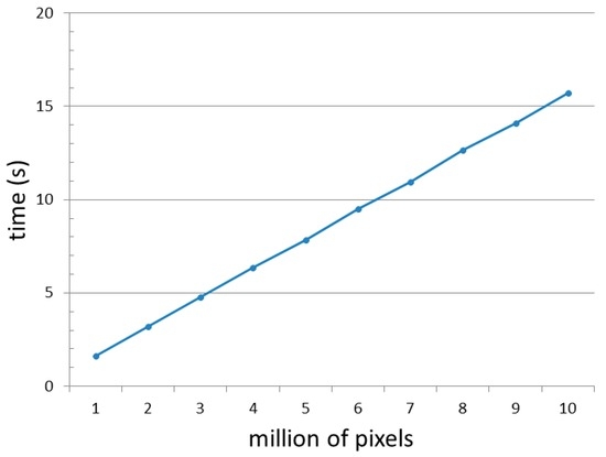 To evaluate how the computational speed increases with the increasing number of pixels, we derived SLIC superpixels for a 4-band QuickBird scene with extents ranging from 1 to 10 million pixels, with an increment of 1 million (Figure 5). From the resulted runtime, which ranged between 2 s and 16 s, we can conclude that for a 4-band VHR satellite image, with each layer of one million pixels, the SLIC algorithm needs approx. 2 s to extract superpixels (i.e., for a 30 million pixels QuickBird scene it will need approx. 1 min to generate SLIC superpixels).