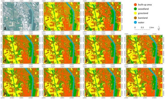 Random forest (RF) classification results for T2: (a) original QuickBird RGB image, (b) pixel-based classification, (c) multiresolution segmentation classification, (d–g) SLIC superpixels classification of 5 × 5, 10 × 10, 15 × 15 and 20 × 20 pixels initial size of superpixels and (h–k) SLICO superpixels classification of 5 × 5, 10 × 10, 15 × 15 and 20 × 20 pixels initial size of superpixels.