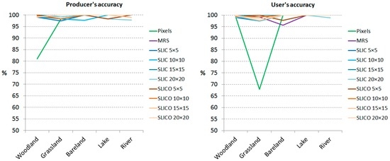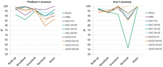 In the case of T2 area, all the classifications kept the general pattern of class distributions within the image (Figure 7). However, a quantitative analysis reveals differences between approaches. Pixel-based classification has the lowest OA (91.45%) and this is due to the confusion between bareland and build-up areas, giving the lowest values of PA for build-up areas (91.46%) and lowest UA for bareland class (56.62%). Also, the pixel-based approach has difficulties in distinguishing woodland from grassland, having the lowest PA for woodland (85.98%) and the lowest UA for grassland (91.62%) (Figure 8). Unexpectedly, classified objects resulted from MRS (OA of 96.09%) and SLIC and SLICO superpixels have the classification accuracy comparable (OA between 95.17% and 97.21%) (Table 6). Even more, all the four sizes of SLIC superpixels and two SLICO superpixels (5 × 5 and 15 × 15) outperformed the MRS-based classification regarding the OA values. The highest OA was achieved by SLIC 20 × 20 RF classification, of 97.21%.
