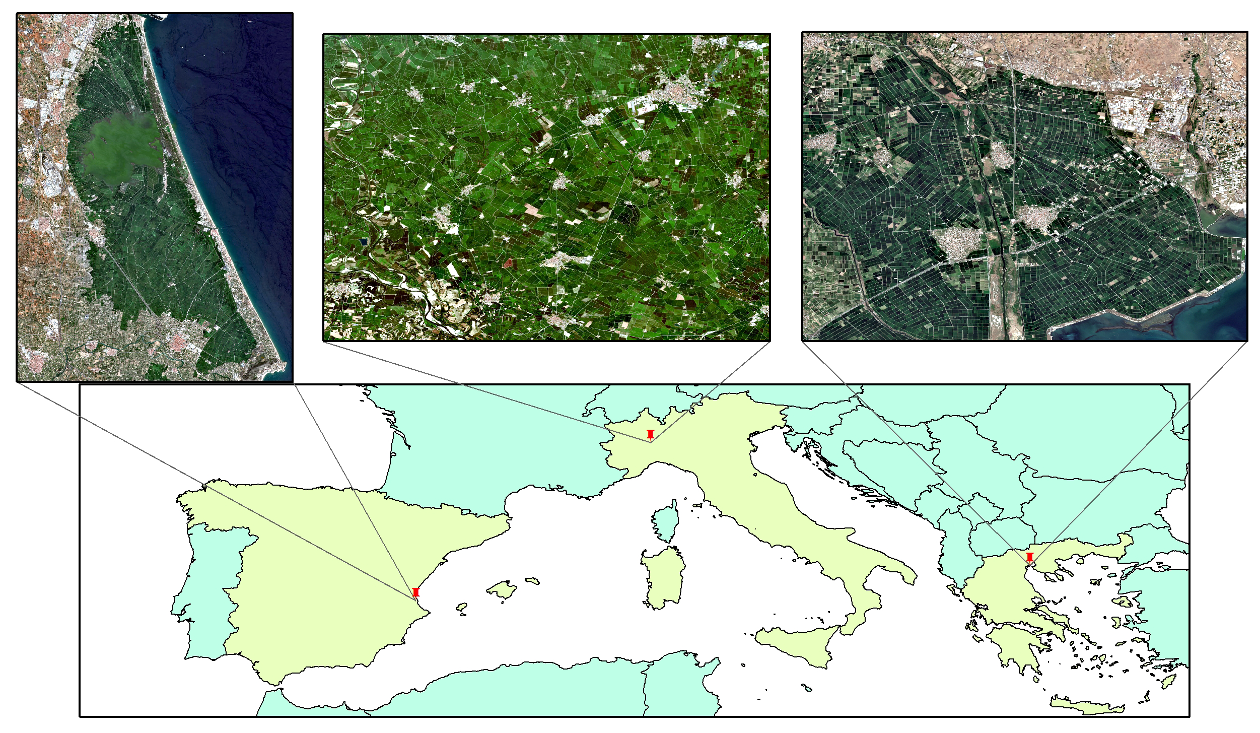 The study areas have been selected in three Mediterranean countries, which are responsible for 85% of total European rice production: Italy (51.9%), Spain (25.4%) and Greece (7.0%) (see Figure 1). The Spanish study area is located in the rice district of Valencia (east of Spain) belonging to the Albufera Natural Park, which is a special protection area, thus allowing only rice crop practices. The Italian study area belongs to the Lomellina rice district (south-western Lombardy region), where rice is the dominant crop (>90%). The Greek study area is located in the rice district of Thessaloniki, which is the main cultivation area for Greece. Within each study area, rice is a common crop with a long tradition and economic value.