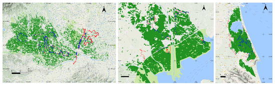 The Sentinel-2A mission of the Copernicus program provides enhanced continuity of data so far provided by SPOT-4/5 and Landsat-7/8 missions. In this framework, the European Space Agency (ESA) provides free and open access to the Sentinels’ data from the Sentinels Scientific Data Hub (https://scihub.copernicus.eu/). In this study, Sentinel-2A Level 1C data (top-of-atmosphere reflectances in cartographic geometry) were downloaded from early May up to the end of September in 2016 for the three study areas providing information every 10 days in 13 bands in the visible, near infra-red and short wave infra-red spectrum at a 10-, 20- and 60-m spatial resolution depending on the spectral band. Table S1 in the Supplementary Materials section lists the Sentinel-2A images used over the three areas.