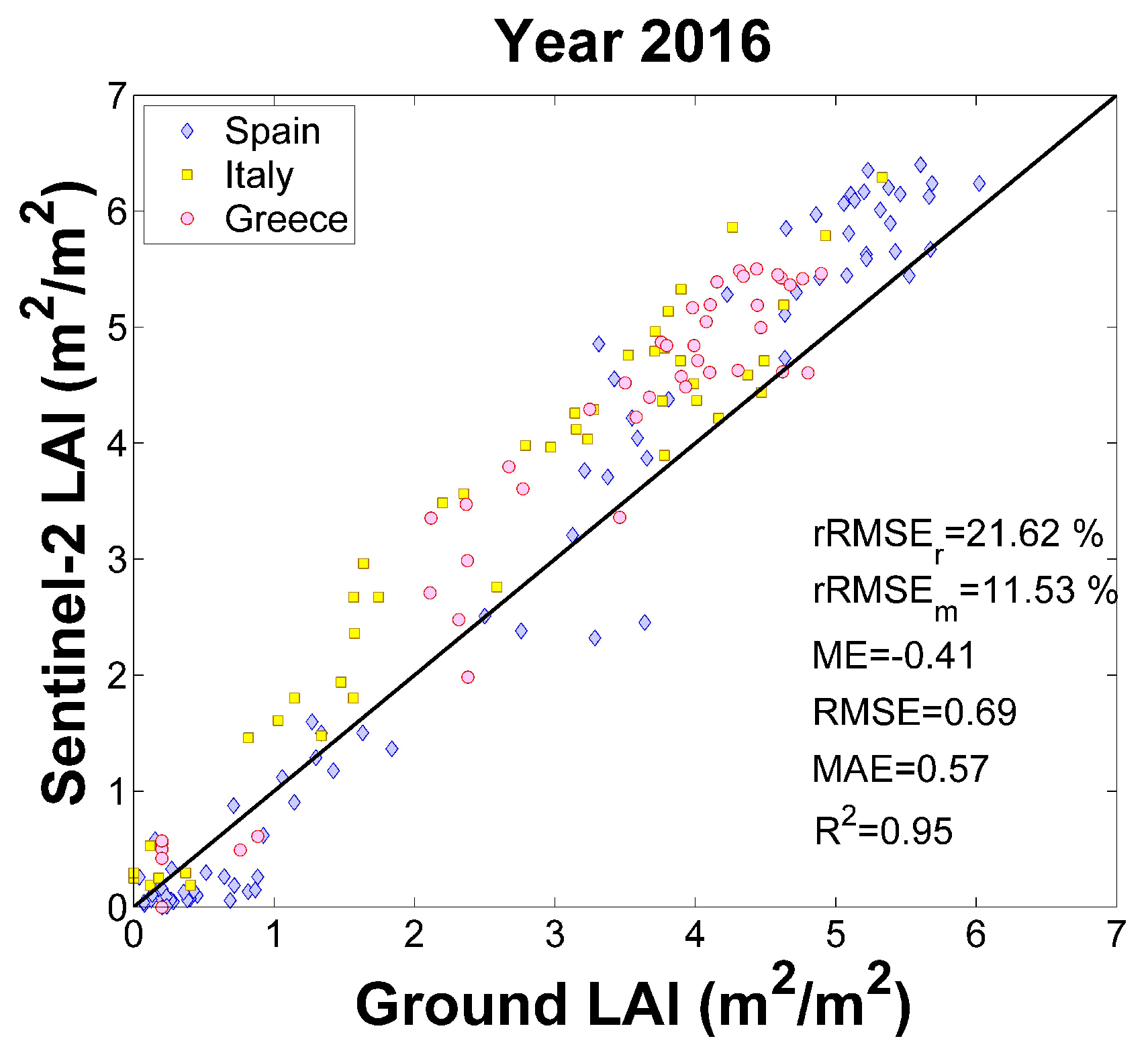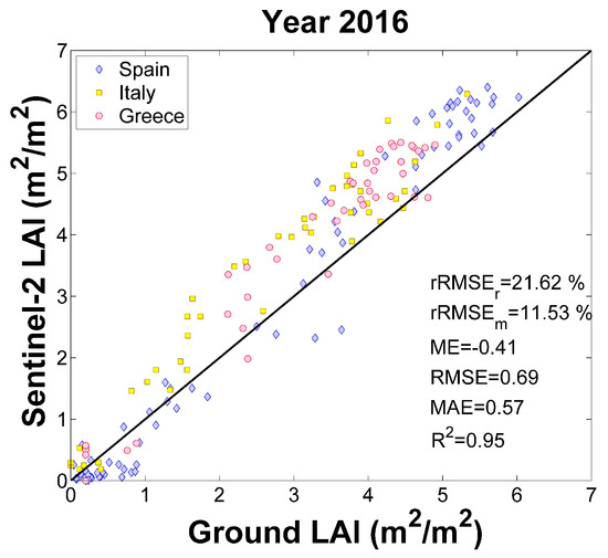 The availability of LAI ground measurements allowed assessing the high-resolution LAI estimates. The root mean squared error (RMSE), mean error (ME), mean absolute error (MAE) and coefficient of determination (R2) were computed in order to assess the accuracy of the retrievals, bias and goodness-of-fit (see the values in Figure 4 and the metrics in Table S3 of the Supplementary Materials section). Good accuracy and high correlation were found revealing an overall RMSE of 0.69 m2/m2 and a coefficient of determination of 0.95. A slight bias was observed between Sentinel-2A LAI estimates and ground data. More in detail, Table 2 shows the statistical indicators between ground data and Sentinel-2A estimates over each study area. In general, very high correlations were found. Low biases were observed in the case of the Spanish study area, while in Italy and Greece, small biases were observed with respect to the ground data (see Table 2). Biases could be explained due the rice ESU heterogeneity and the slight underestimation of PocketLAI regarding other measurements [32]. Relative RMSE to mean () and relative RMS to range () are also reported in Table 2 and Figure 4 showing good accuracies and revealing that the Sentinel-2A LAI estimates are suitable to be integrated into crop models [48].