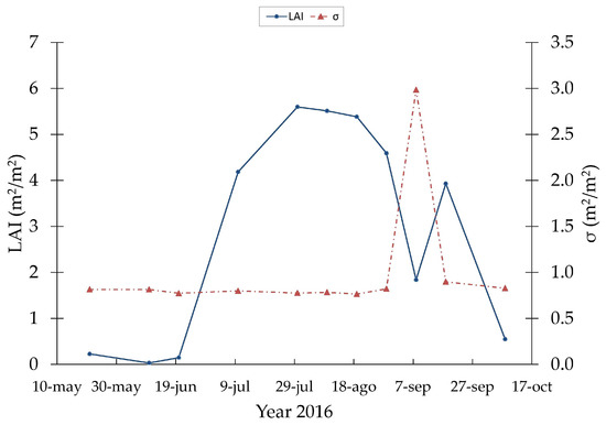 Temporal evolution of LAI and uncertainty (σ) over a rice field in Spain during the 2016 rice season.