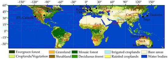 Regions of interest selected from global land region from 45°S to 60°N overlapped with land-cover data in 2009 obtained from Europe Space Agency (ESA, [25]). Nine different regions of interest are outlined as red rectangles, including Forest in Northern Canada (FnC), Forest in Eastern Russia (FeR), Cropland in Western Russia (CwR), Cropland in Northern China (CnC), Cropland in Northern India (CnI), Cropland in Eastern Brazil (CeB), Grassland in Central Africa (GcA), Mixed forest in Southern Africa (FsA) and Shrub-land in Northern Australia (SnA). Six regions in the Northern Hemisphere, including FnC, CwR, FeR, CnC, CnI, and GcA, are used for correlation analysis of seasonal cycle between NDVI and XCO2 in Section 3.2, while five regions, including CnI, GcA, CeB, FsA, and SnA, are used for correlation analysis of seasonal variations between LST and XCO2 in Section 4.2. Twelve selected sites of TCCON are marked with black dots and used for evaluating mapping data in Section 4.1.2.