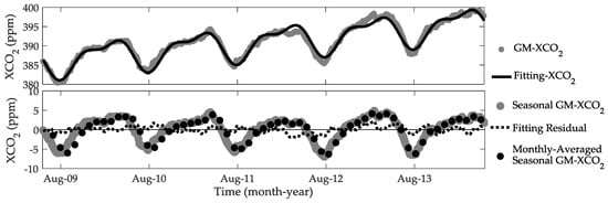 Example of fitting GM-XCO2 using Equation (1) in the top panel, in which (k0, k1, a1, a2, b1, b2) = (386.058, 0.0163, −0.555, 1.116, −3.731, −1.311). In the bottom panel, the seasonal GM-XCO2 (dXCO2) is calculated by removing the yearly increases from the temporal variation of GM-XCO2. The fitting residual is the difference between GM-XCO2 and the fitting. Monthly-averaged seasonal GM-XCO2 is the monthly mean of dXCO2, which is used in Section 3.2.