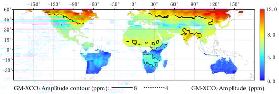 Spatial distribution of SCA of XCO2 in global land areas derived from the GM-XCO2 dataset from June 2009 to May 2014. The SCA for each grid is calculated by fitting Equation (1) to the 5-year time series of GM-XCO2 and obtaining the annual mean of differences between peaks and troughs after subtracting the linear trend of the yearly increase. Two contour lines for amplitude of 8.0 ppm and 4.0 ppm are outlined with solid and dotted black lines, respectively.