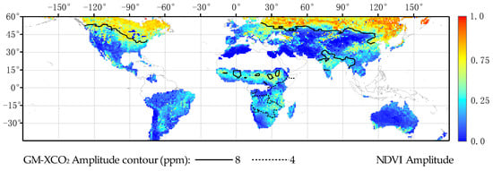 Spatial distribution of NDVI SCA, which is calculated for each grid by fitting Equation (1) to the 5-year NDVI data and obtaining the annual-mean differences between peaks and troughs after subtracting the linear trend. The two overlapped contour lines are the XCO2 SCA from GM-XCO2, with 8.0 ppm in solid black line and 4.0 ppm in dotted black line as shown in Figure 3.
