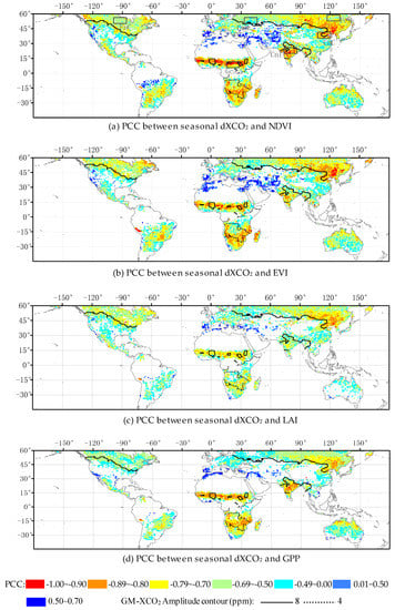 In this section, correlation analyses are conducted, respectively, between seasonal variations of GM-XCO2 data and several biophysical parameters associated with biosphere activities, including NDVI, EVI, LAI and GPP, to explore the underlying biosphere–atmospheric coupling process that drives the XCO2 seasonality. Figure 5 shows the global distribution of the Pearson Correlation Coefficients (PCCs) with a significant level (p-value < 0.01) between monthly-averaged dXCO2 and NDVI, EVI, LAI, and GPP, respectively, from June 2009 to May 2014 in each grid. Due to the lack of available data, the tropical forests in Amazon and Southeast Asia and the Tibetan Plateau are not considered here.