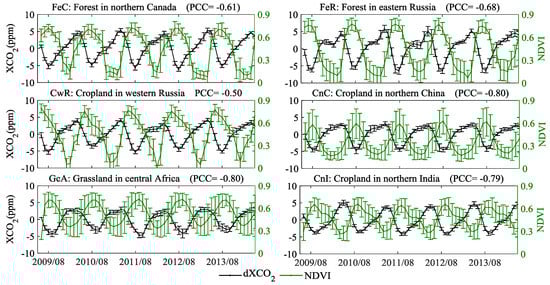 We selected six regions of interest with a PCC higher than 0.5 distributed across multiple latitudes as shown in Figure 6 to investigate the correlation of seasonal variations of XCO2 and NDVI from June 2009 to May 2014. These six regions of interest are shown in Figure 1, including FnC: forest in Northern Canada covered by 63% of forest, FeR: forest in Eastern Russia covered by 86% of forest, CwR: crop in Western Russia covered by 70% of cropland, CnC: crop in Northern China covered by 58% of cropland with mixed 18% grassland and shrub-land, GcA: grass in Central Africa covered by 36% of grassland mixed with 30% of forest, and CnI: crop in Northern India covered by 89% of cropland.