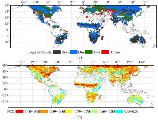 (a) The global distribution of phase delay effect, in terms of lags of months, between seasonal variations of XCO2 and NDVI, and (b) the correlation between XCO2 and NDVI if the phase delay effect is excluded. Only grids with month lags of no more than three are shown.