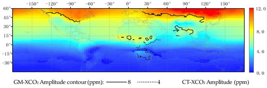 As suggested by previous studies [11,27,53,58], model simulations can well reproduce the large-scale features of atmospheric CO2. On the other hand, satellite observations make direct measurements of XCO2 and, therefore, be able to capture the local variability and a more detailed characteristic of XCO2 variation compared to model simulations. Therefore, we compare the SCA of GM-XCO2 to that of simulated XCO2 from CarbonTracker in order to evaluate the satellite measurements and the mapping dataset. Figure 9 shows the global distribution of XCO2 SCA derived from the CarbonTracker (CT2015) data, overlapped with the contour lines of GM-XCO2 amplitudes shown in Figure 3. Comparing Figure 3 with Figure 9, it can be clearly seen that the spatial pattern and latitudinal gradient of GM-XCO2 SCA is in good agreement with CT-XCO2, especially in the high-latitude NH areas where the contour lines from GM-XCO2 amplitude match well with the changes of SCA from CT-XCO2. Moreover, the phenomenon of higher SCA over India and Central Africa than surrounding areas can be seen in SCA maps from both GM-XCO2 and CT-XCO2. The SCA difference map of GM-XCO2 and CT-XCO2 is shown in Figure S3. Over the NH high-latitude area, the GM-XCO2 SCA is generally lower than that of CT-XCO2, which agrees with the results, as shown in Table 3, that GM-XCO2 SCA is generally lower than TCCON sites at the same area (Bremen, Karlsruhe, Orleans, Garmisch, and Bialystok). Over the low latitude area, GM-XCO2 SCA is generally higher than that of CT-XCO2, especially over the areas within the overlapped GM-XCO2 contour lines of 8 ppm and 4 ppm (Such as India and Southern Africa). There are two possibilities for these local inconsistencies: (1) the retrieve error of satellite observations may be large over these areas because of the impacts of thin clouds and disturbance of wildfire [57,69]; (2) the uncertainty of simulations by current models [8,70] may be large over these areas because of the sparseness of the ground-based measures and airborne observations used for assimilations to constrain the local CO2 fluxes [20,66]. This comparison shows that satellite observations of XCO2 with appropriate analysis can be used to assess the earth system modeling coupled with carbon flux estimates, as also suggested by Hammerling et al. [71]. We can conclude that the GM-XCO2 SCA is generally consistent with that of CT-XCO2 on a large scale, even though the discrepancies over some local areas need further investigation.