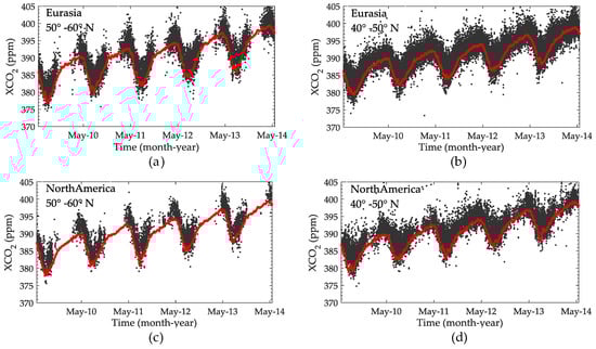 XCO2 from GOSAT-ACOS retrievals (black) and CarbonTracker (red) from June 2009 to May 2014 over mid- and high latitude of North Hemisphere. XCO2 over latitude bands between 50°–60°N in (a) Eurasia and (c) North-America land regions, and between 40°–50°N for the same two regions in (b,d), respectively.