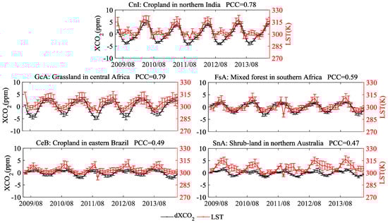 Abnormal results are shown over some regions (e.g., CnI, GcA, FsA, and CeB) in the tropical area (30°N–30°S), where large XCO2 SCA can be seen from both GM-XCO2 and CT-XCO2, even the former is slightly larger than the latter, and high PCCs exist for NDVI and EVI, as shown in Figure 5. These regions are covered by vegetation, such as grass, forest, and crop mixed with bare land, where the interaction between CO2 uptake and release from vegetation and soil respiration likely has impact on the seasonal cycle of CO2. As indicated from previous studies on CO2 emission from soils, the soil respiration in the tropic and subtropical areas is much larger than high latitudes [72,73] and, therefore, likely has non-negligible impact on the XCO2 seasonal pattern. LST, a remotely sensed terrestrial parameter, is effective in depicting the land surface temperature distribution at the global scale with long time-series. LST has been used as one of the critical parameters in estimating seasonal soil respiration over forests in the Midwest USA [74]. Higher surface temperature is associated with stronger soil and plant respiration rates, but also possibly enhanced photosynthesis [33]. However, the net effect of increasing LST in the tropical areas has been shown to result in increasing atmospheric CO2 [34]. In tropical areas, soil and plant respiration contribute a very important part to the seasonal variation of atmospheric CO2. The tropical carbon storage is very vulnerable to temperature change [34]. Therefore, an investigation of the correlation between XCO2 from satellite observation and LST can indicate the possible impact of LST on the seasonal variation of XCO2 in the tropical areas, where the carbon storage has been shown to be sensitive to future temperature variabilities [34].