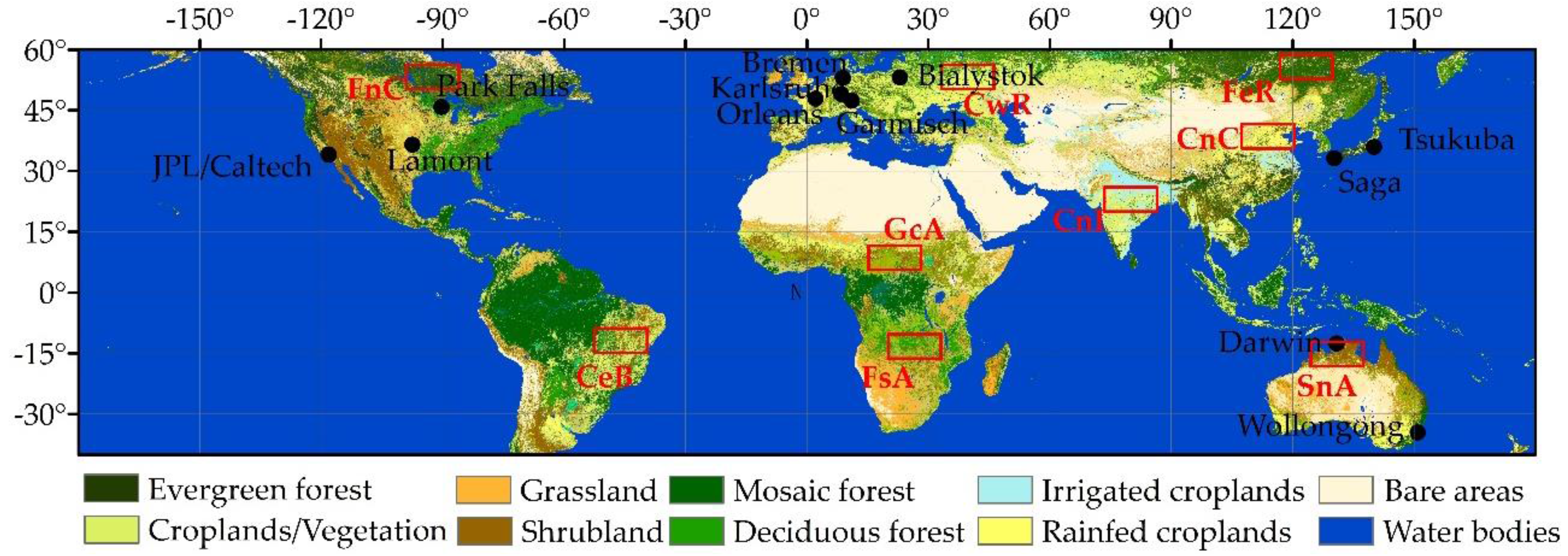 - Warneke, T.; Messerschmidt, J.; Notholt, J.; Weinzierl, C.; Deutscher, N.; Petri, C.; Grupe, P.; Vuillemin, C.; Truong, F.; Schmidt, M.; et al. TCCON Data from Orleans, France, Release GGG2014R0; Carbon Dioxide Information Analysis Center: Oak Ridge, TN, USA, 2014.