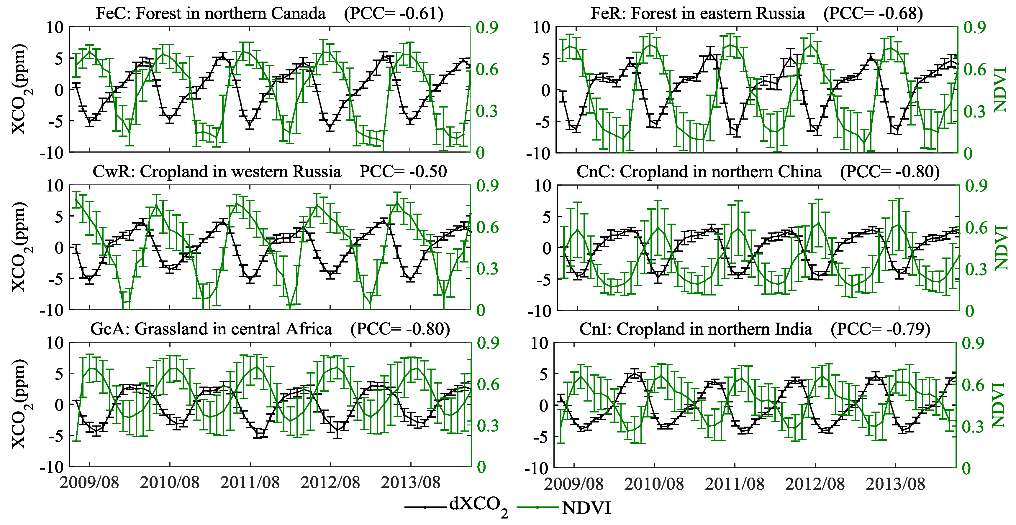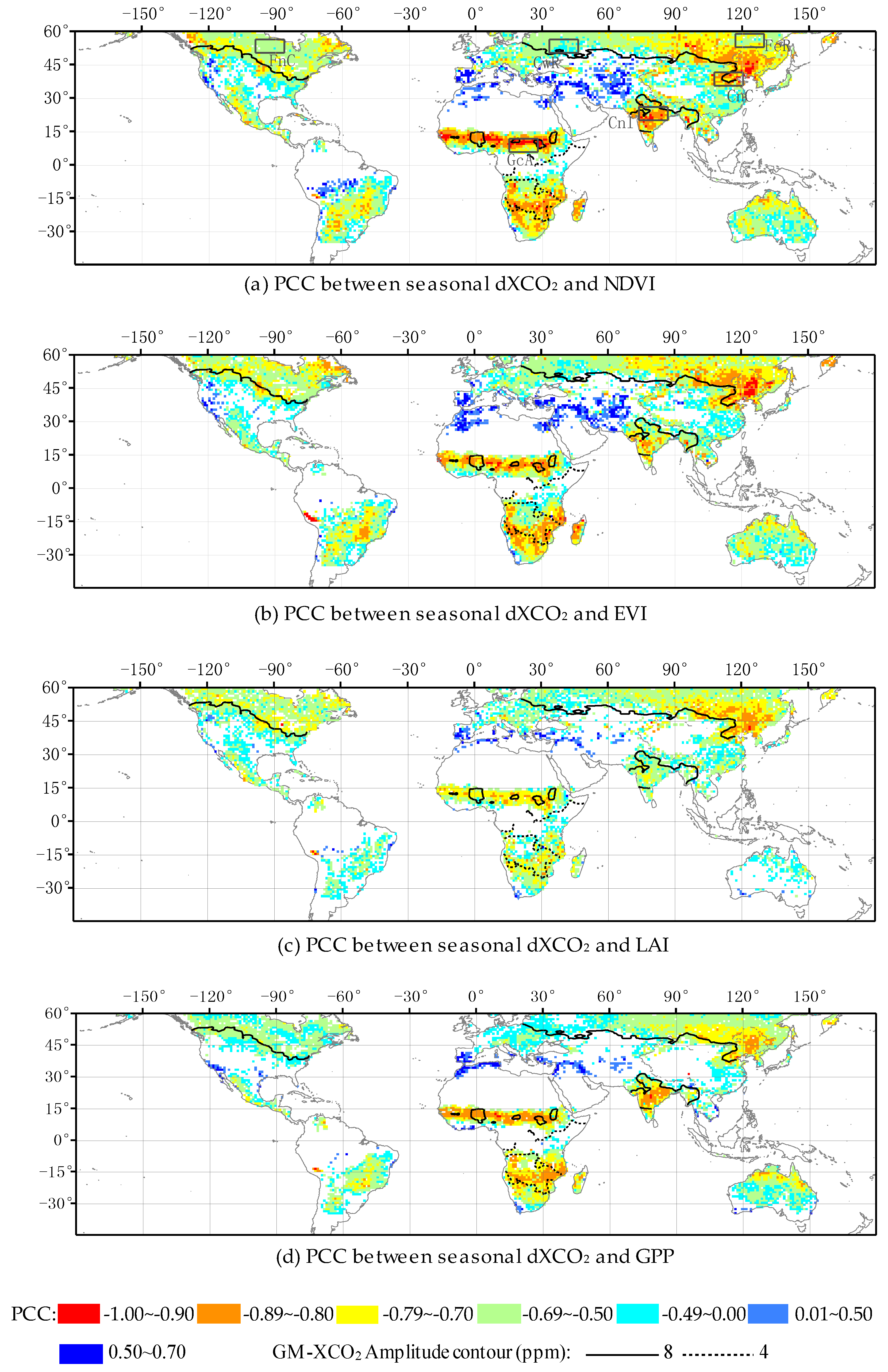 2.3. Correlating Analysis of Seasonal Variation between XCO2 and Biosphere Parameters