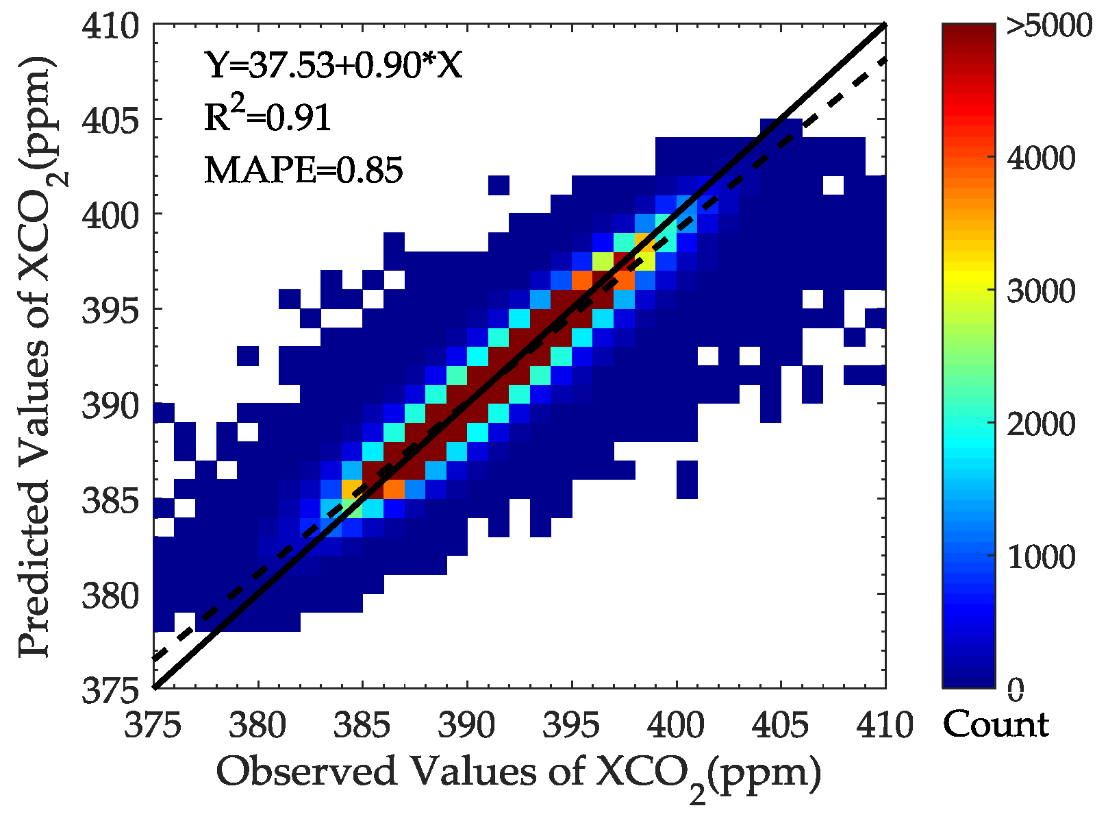 - Zeng, Z.C.; Lei, L.; Strong, K.; Jones, D.B.A.; Guo, L.; Liu, M.; Deng, F.; Deutscher, N.M.; Dubey, M.K.; Griffith, D.W.T.; et al. Global land mapping of satellite-observed CO2 total columns using spatio-temporal geostatistics. Int. J. Digit. Earth 2017, 10. [Google Scholar] [CrossRef]