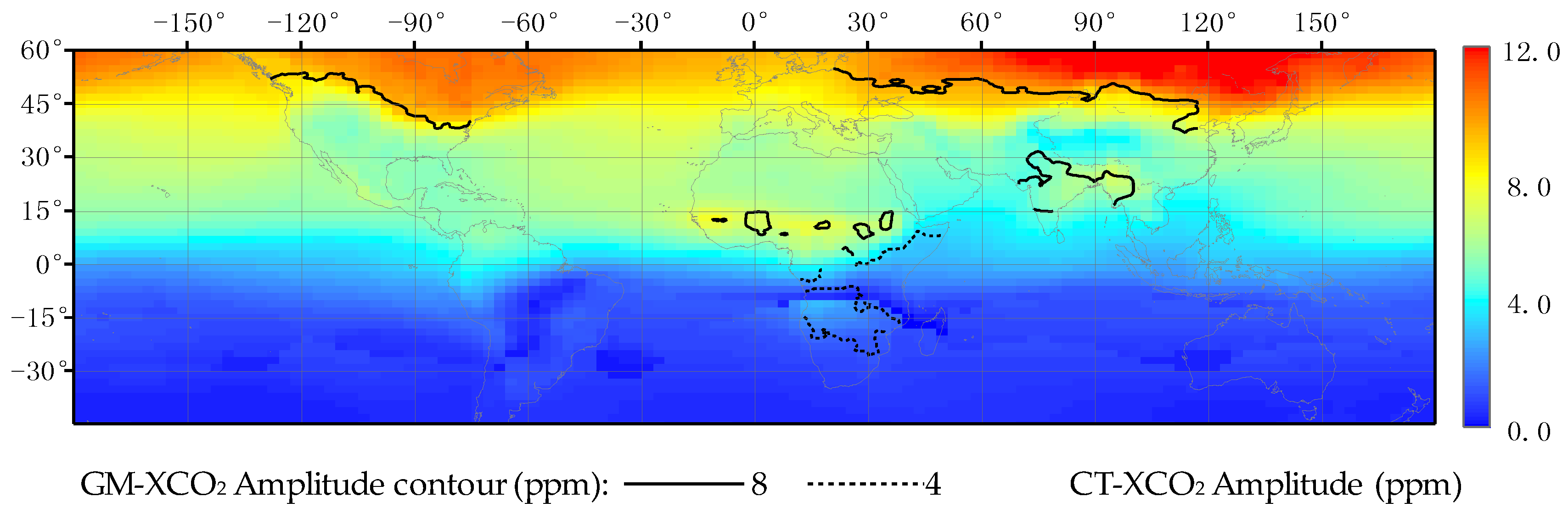 4.1.3. Comparison of Seasonal Cycle between GM-XCO2 and Model Simulations