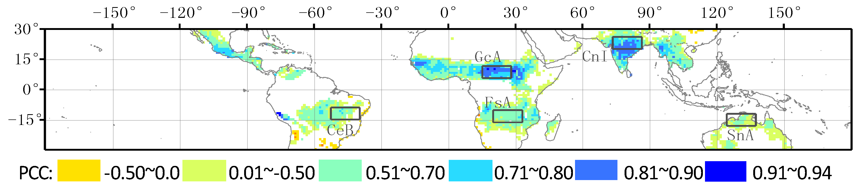 | CnI | Cropland in Northern India | 19°–26°N | 74°–87°E | C: 89% | −0.79 | 0.78 |