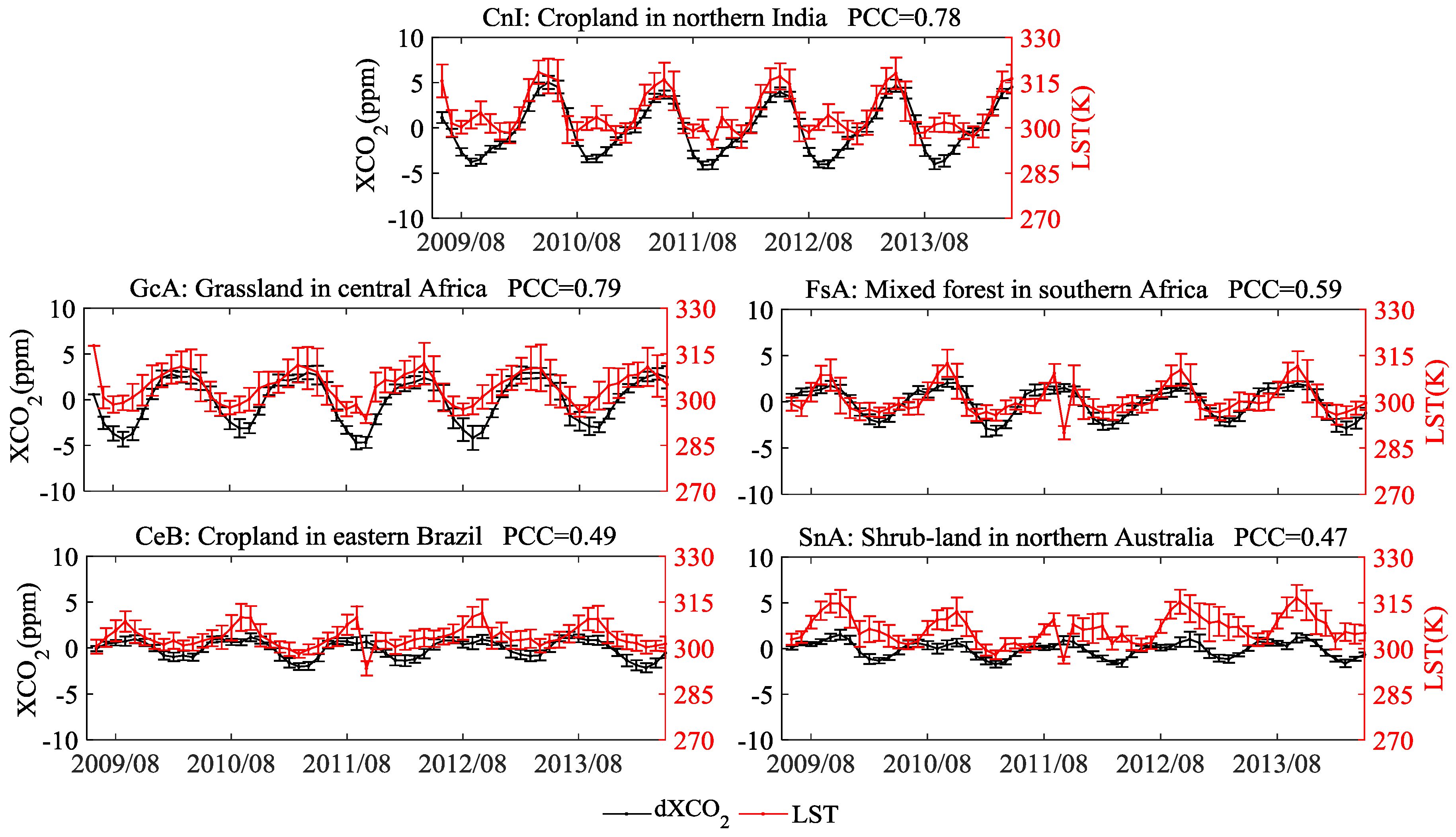 4.3. Possible Impact of LST on Seasonal Variation of XCO2 on Tropical Land