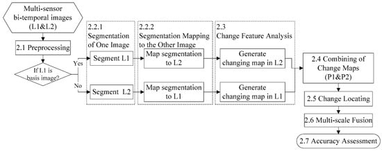 Image segmentation is implemented to obtain image objects for the subsequent object-based processes. In this paper, there are three objectives for the image segmentation: (1) the bi-temporal image objects should be in one-to-one correspondence; (2) the spatial distribution between changed objects and their relevant changed areas needs to be preserved for the subsequent change feature analysis (Section 2.3); and (3) the objects obtained from slight under-segmentation are better able to fit the edges of the changed areas in the other image. Therefore, we propose to segment one of the bi-temporal images and map the segmentation to the other. These two segmentation processes are introduced below.
