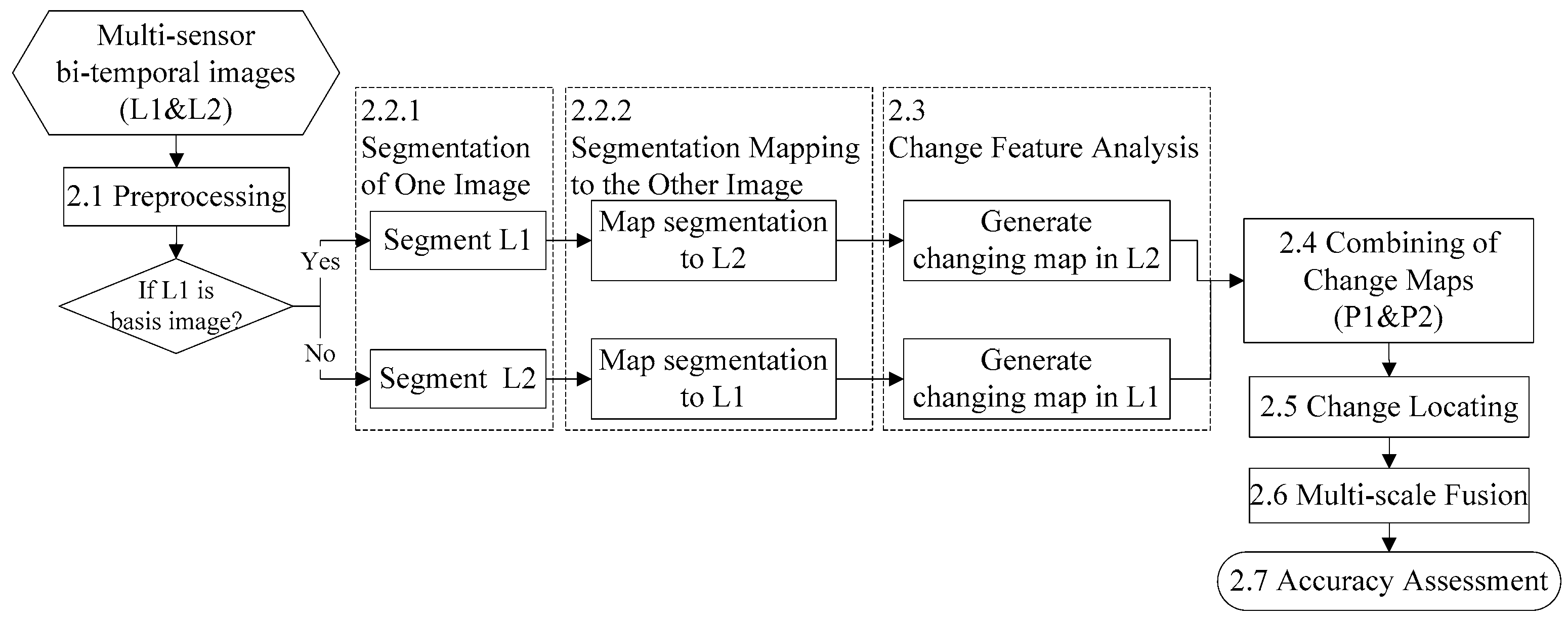 In other words, if any image object is related to local changes, one of these three factors would vary between the bi-temporal images, and the proposed change feature of this object in L2 would be less in L1. Consequently, the change map in L2 can be generated by representing each object with the change probability: