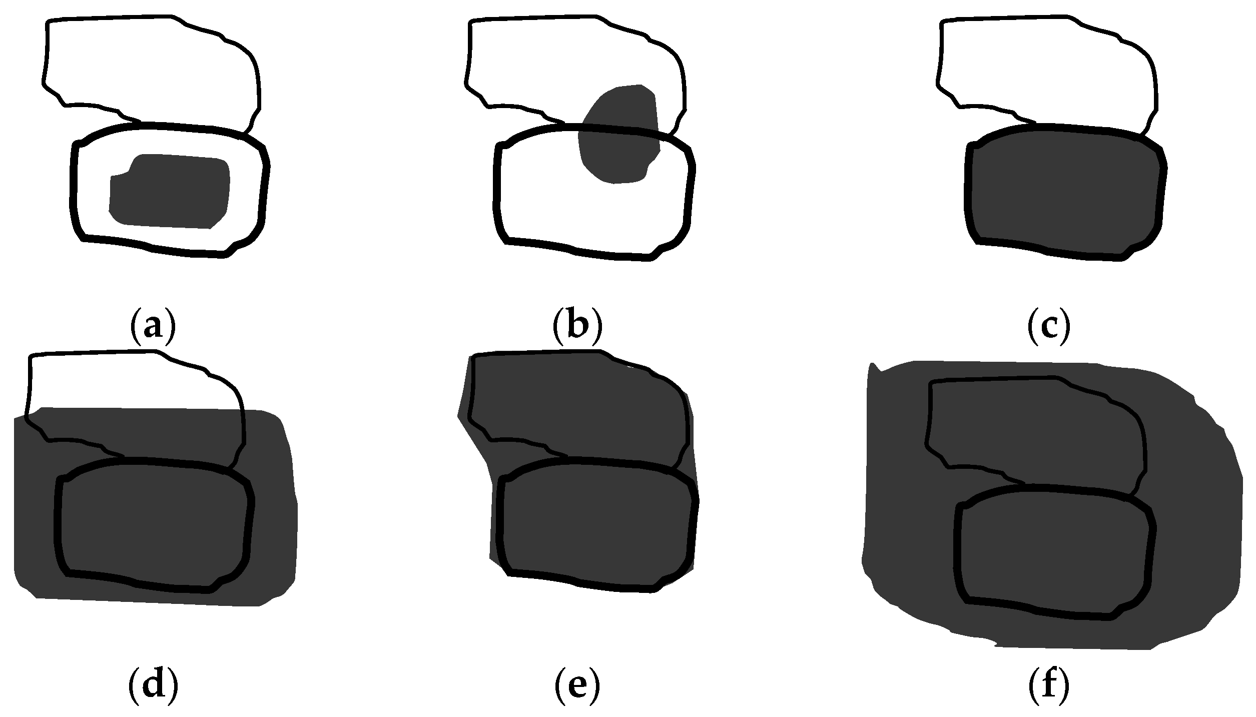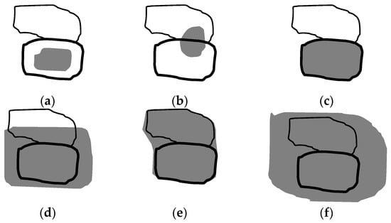 After mapping the segmentation of one image to the other, there will be different spatial distributions between a changed object and its relevant changed area. Figure 2 shows the possible distributions of a changed object and its relevant changed area, in which the bold object represents a changed object, and the object above it is one of its neighboring objects. The shadow area represents the relevant changed area. Through analyzing the six possible distributions in Figure 2, we can deduce the statistical feature variation of the changed objects as follows: