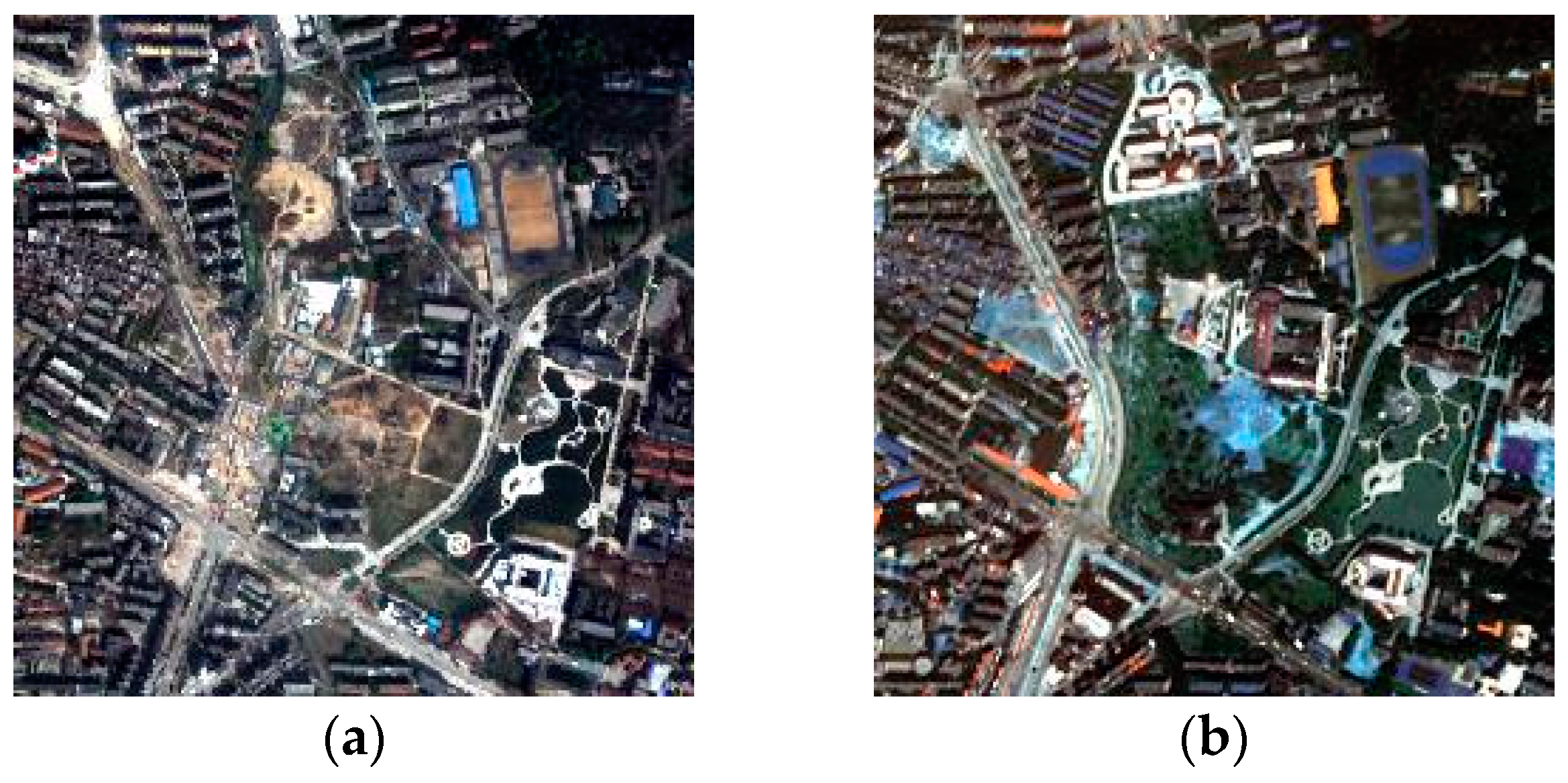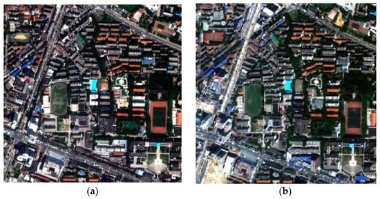 With L1 as the basis image, L2 was interpolated to the spatial resolution of L1. Figure 3 shows the bi-temporal images after the interpolation, which are both 400 × 400 pixels. In order to avoid the effects of vegetation phenology and solar elevation, the vegetation and shadow were extracted and masked out.