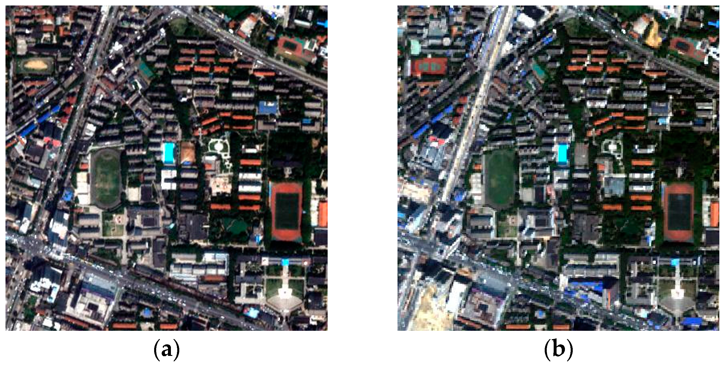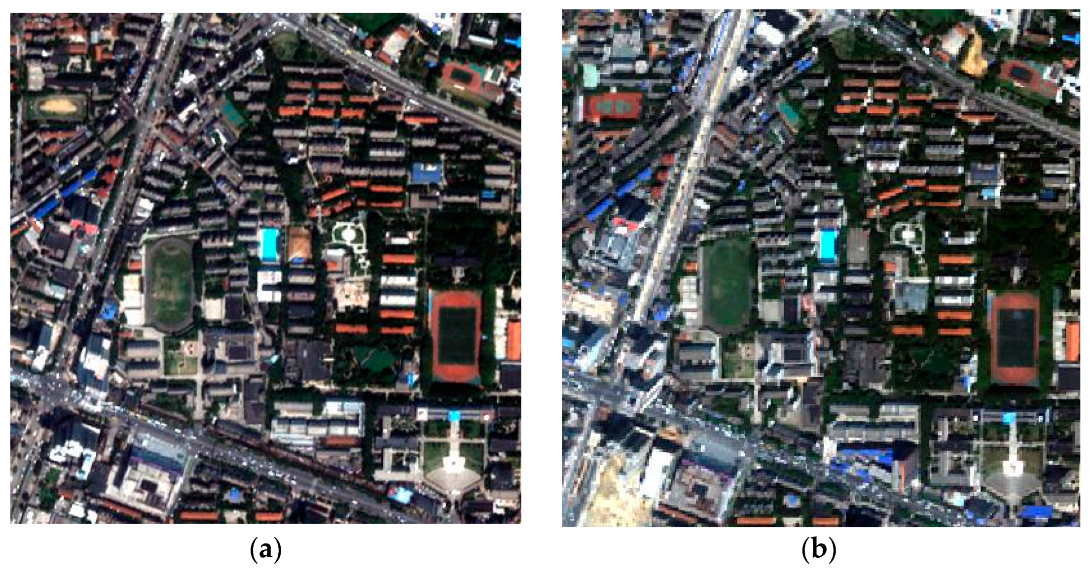 Degraded bi-temporal images of the first study area: (a) acquired by QuickBird in April 2005 (L1) and (b) acquired by IKONOS in July 2009 (L2).