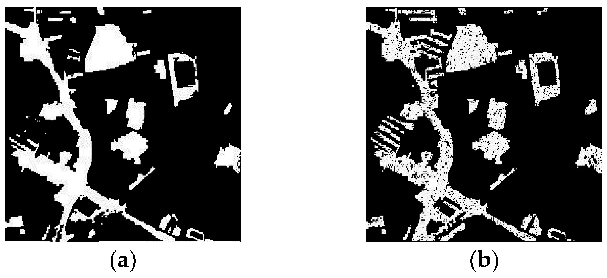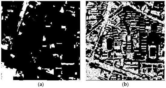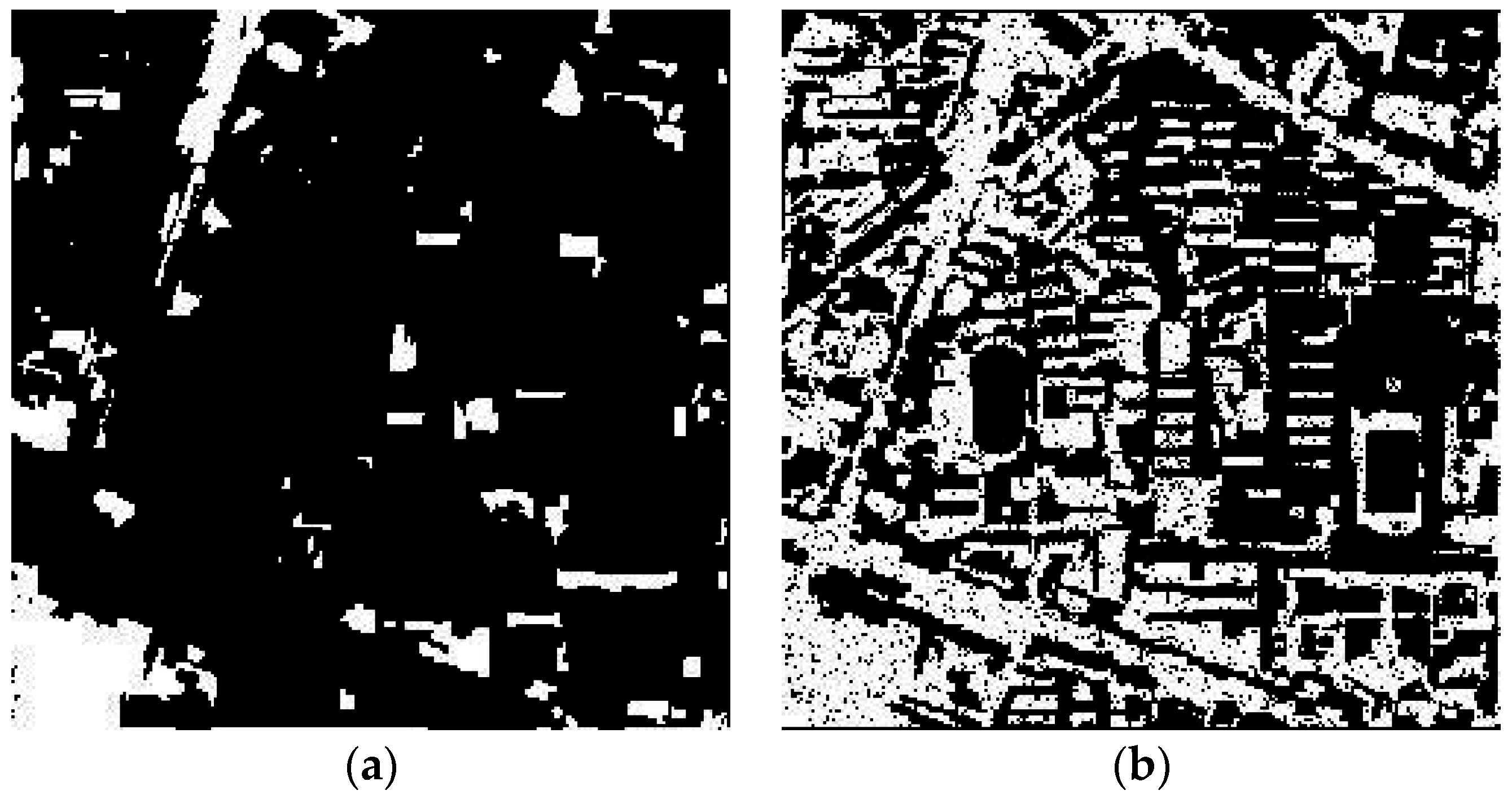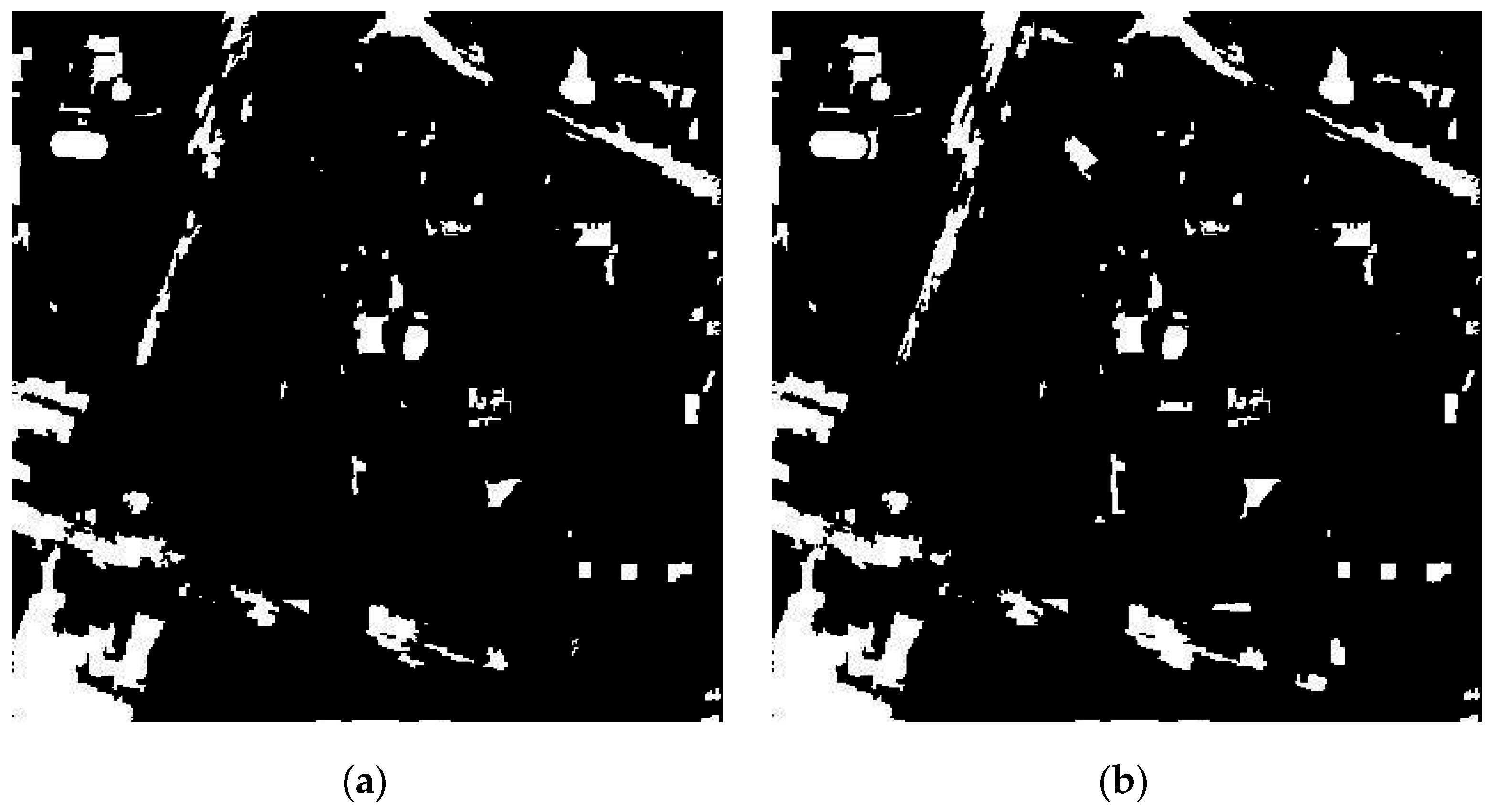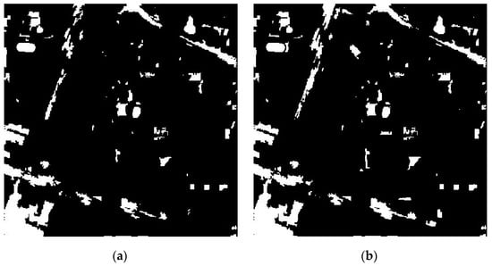 Change detection maps resulting from (a) the proposed multi-scale k-means method and (b) the method using varying geometric and radiometric properties [35], with L2 as the basis image in the second study area (scale = 50).