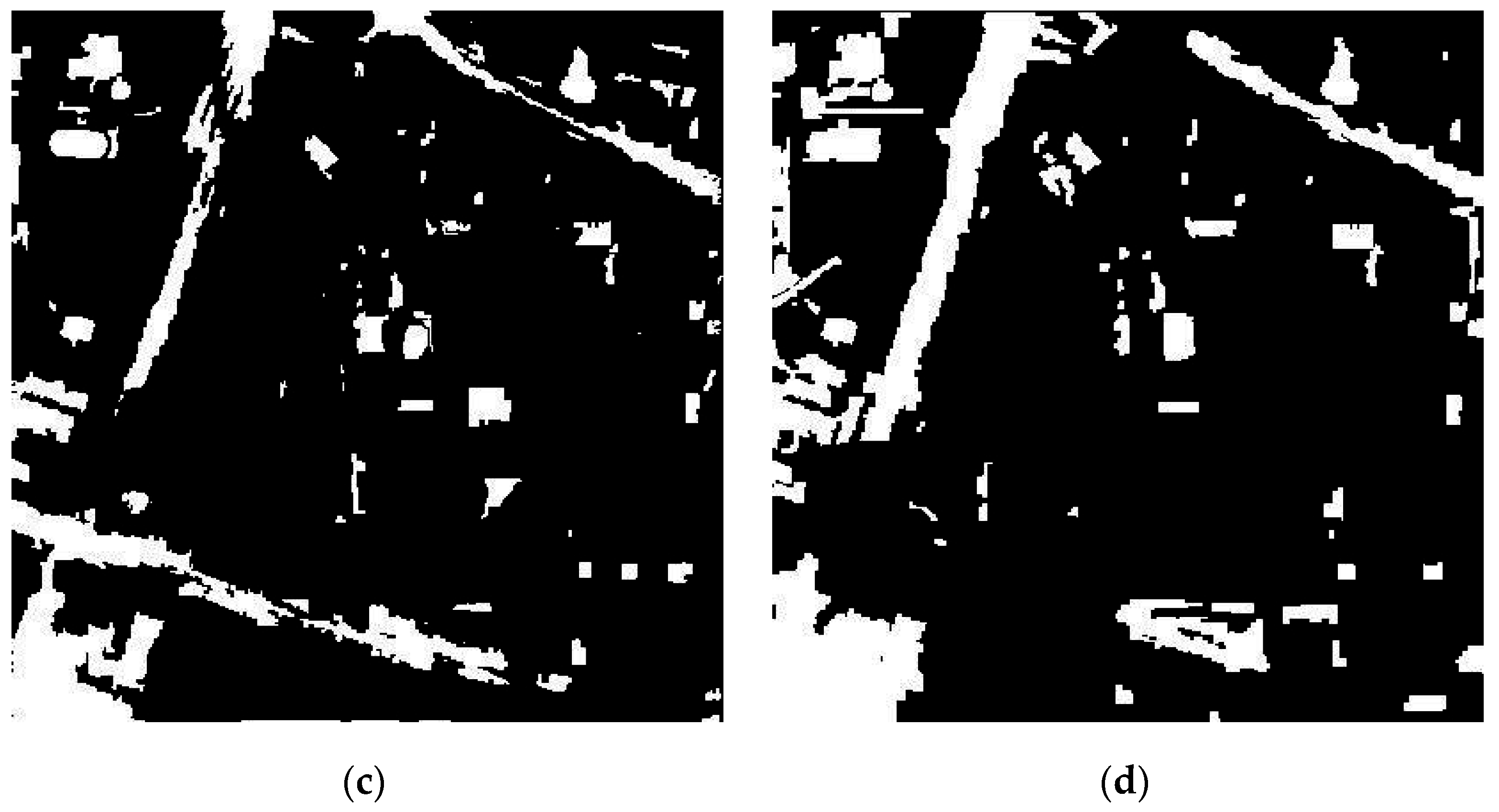 The results are visually compared in Figure 4, in which the white and black regions, respectively, represent the changed and unchanged areas. The results of the three methods are similar, but the number of false alarms for k-means clustering (k = 2) is slightly more than for the other two methods, and the missed alarms are fewer in number, especially in the road areas.