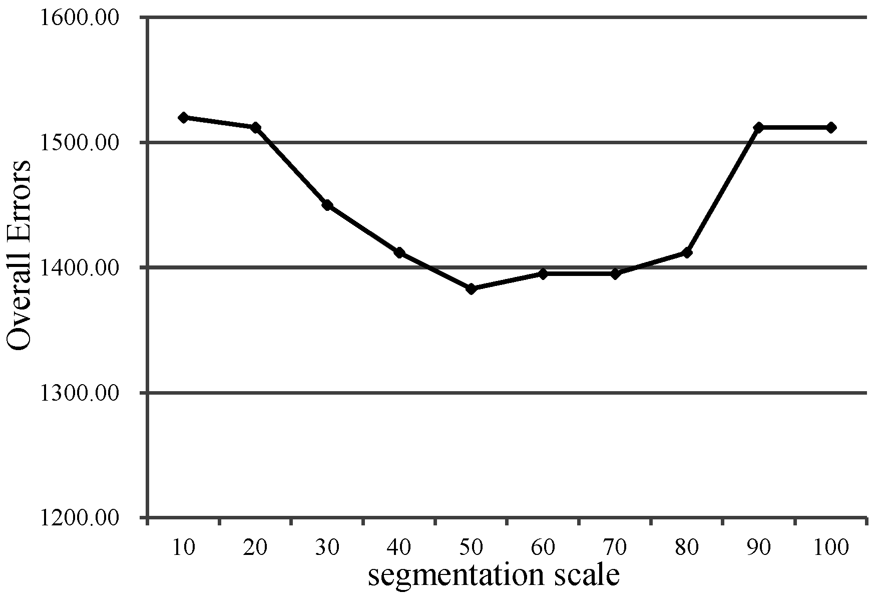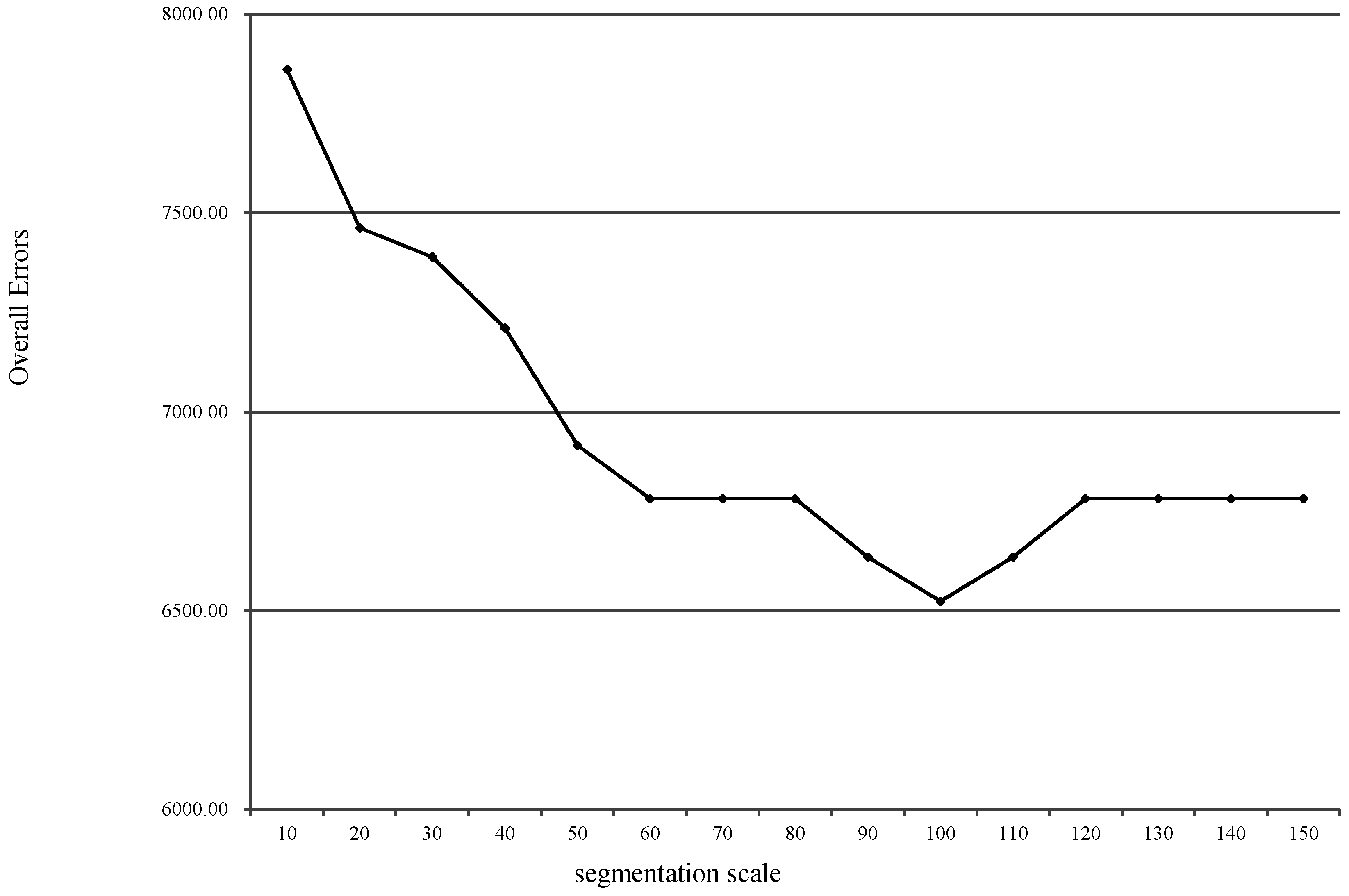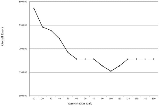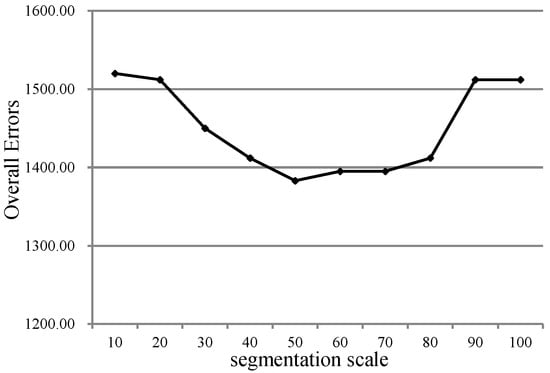 Overall errors of the change detection with different segmentation scales, with L2 as the basis image in the first study area.