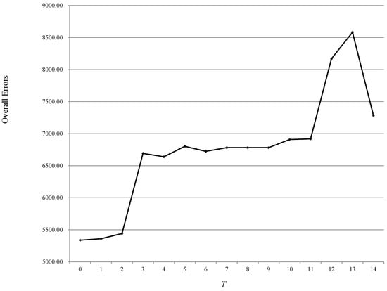 According to the spatial resolution and the objects’ sizes in the bi-temporal images after preprocessing, the scale interval and step size increase were set as [10, 100] and 10, respectively. Figure 10 shows the results of the proposed single-scale method using different segmentation scales. The optimal scale is 50. As can be seen in Figure 6, the overall errors are the lowest when Tf in Equation (13) is 0. In addition, Table 5 shows the improvement of the multi-scale fusion with Tf equal to 0, which was realized by k-means clustering (k = 2).