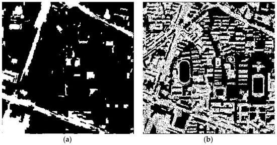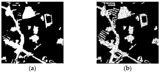 Change detection maps resulting from (a) the proposed multi-scale k-means method and (b) the method using varying geometric and radiometric properties [35], with L2 as the basis image in the first study area (scale = 50).