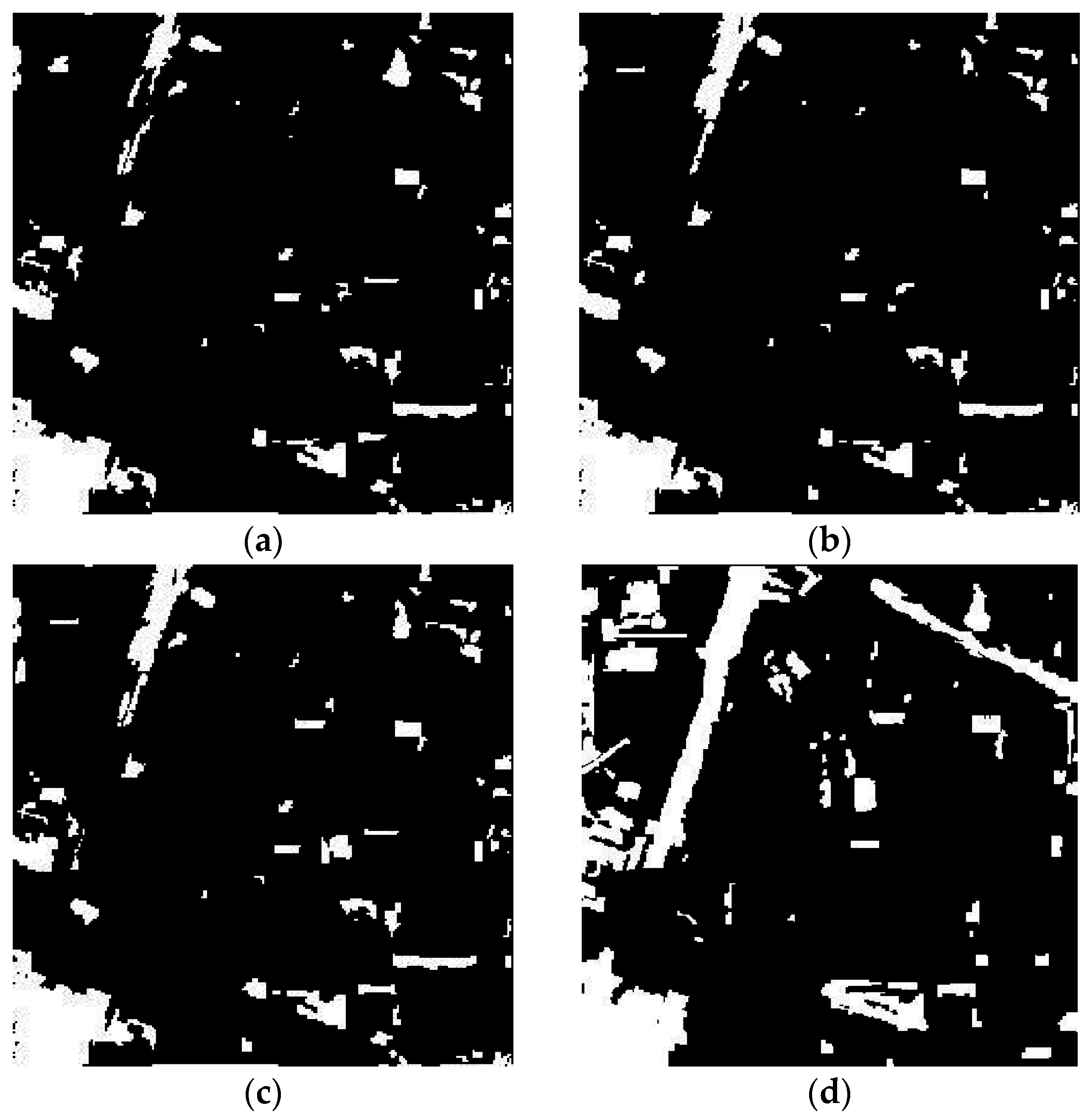 Change detection maps resulting from: (a) Otsu’s thresholding method, (b) threshold selection by clustering gray levels of boundary, and (c) k-means clustering (k = 2), compared with (d) the reference image, with L2 as the basis image in the second study area (scale = 50).
