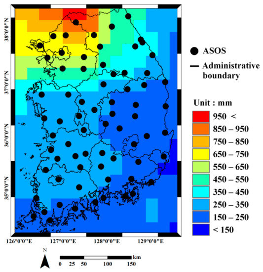 The original monthly TRMM data at a resolution of 0.25° were first geocoded using a transverse Mercator projection with a spatial resolution of 25 km. The monthly accumulated precipitation at a mm scale was finally prepared for integration with the rain gauge data. Monthly accumulated rainfall measurements obtained from 71 automated synoptic observing systems (ASOS) over South Korea were used for integrating and validating the prediction results (Figure 1). ASOS data are available mainly over land, so the integration and downscaling results were generated only over land. The target resolution for downscaling was set experimentally to 1 km.