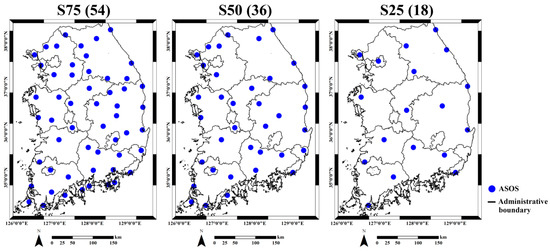 This study was initiated to investigate whether merging rain gauge data and the satellite precipitation product could improve the predictive performance in fine resolution mapping of precipitation. For this purpose, different rain gauge density scenarios are considered in the performance evaluation. The impact of the rain gauge density scenarios on the predictive performance of different kriging algorithms is evaluated using leave-one-out cross-validation (LOO CV). Four sampling density scenarios were considered in this study: 100% (referred to as S100), 75% (S75), 50% (S50) and 25% (S25) of 71 rain gauges. If random sampling is applied to each density scenario, the predictive performance might be affected greatly by sampling fluctuations. Thus, to reduce the impact of the sampling fluctuations caused by random sampling, a systematic procedure to select representative rain gauges [30] is employed. The sum of the distances to the four nearest rain gauges is first computed. The rain gauges with the minimum distance (i.e., too close to neighbors) are then removed. However, when this principle is directly applied to rain gauges in the study area, as shown in Figure 1, most of the rain gauges near the coast are selected, and others on land are removed in S25. To avoid this problem, the selection procedure is serially repeated with respect to the remaining rain gauges. Therefore, the rain gauges with the maximum distance are retained, and the rain gauges in the low density scenario are always included in all of the other scenarios. The distributions of the rain gauges in each scenario are shown in Figure 3.