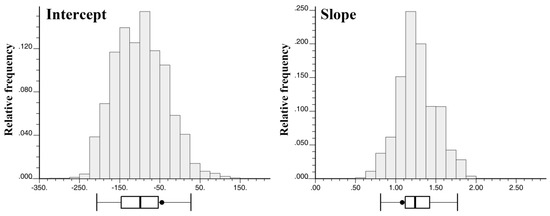 Three multivariate kriging algorithms were applied using GSLIB [44] and FORTRAN programming. As four different rain gauge density scenarios were applied, the different numbers of rain gauges were used to compute kriging weights by considering the maximum number of each scenario and the correlation ranges of variogram models. As a reference for the spatial distributions obtained by integration, the downscaled TRMM precipitation estimates were first integrated with all 71 rain gauges (i.e., S100). Figure 5 shows histograms of the regression coefficients (intercept and slope) for KED in July. The regression coefficients were locally re-estimated by the KED system, so their values constitute distributions, rather than a single value in SKLM, and thus, the local trends varied across the study area.