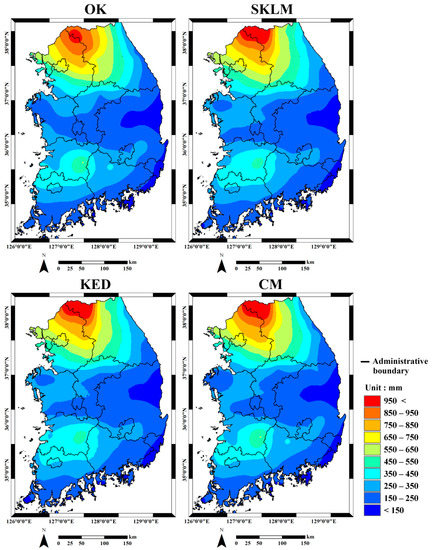 To analyze the differences of predictions without or with the integration of the TRMM precipitation product, the error statistics and predictions obtained by OK were compared with those obtained using multivariate kriging algorithms (Table 3b). The correlation between the rRMSEs for OK and each multivariate kriging algorithm was also strong. In addition, the average correlation coefficients between the OK predictions and the predicted values by each multivariate kriging were also very strong. All of the multivariate kriging algorithms had high correlation, but CM had the largest correlation coefficients, unlike the analysis result regarding the impact of errors in the TRMM precipitation data. These differences in the impact analysis results may be explained by the characteristics of each multivariate kriging algorithm. In SKLM and KED, soft data contribute to the estimation of the local means. The errors in the soft data are adjusted using hard data, but they might not be fully adjusted. Residuals are the main target of kriging in SKLM and KED, so their dependency on the local means also affects the prediction results. Meanwhile, CM predictions are the sum of the contributions from both the hard and soft data. When few rain gauges are used for CM, the errors in the OK predictions may greatly affect the final CM predictions. Based on these findings, the impacts of errors in the OK predictions may be reduced if the correlation with the OK predictions is low, but that with the TRMM precipitation data is large. For example, the CM predictions for S25 in June had a correlation coefficient of 0.45 with the OK predictions, but 0.948 with the TRMM precipitation data. Thus, the RMSE of the CM predictions (31.44) was smaller than that of the OK predictions (40.44). However, intrinsic errors in the TRMM precipitation data may also have degraded the CM predictions. Thus, the tentative conclusions obtained from this study should be evaluated extensively from experiments using longer time-series datasets.