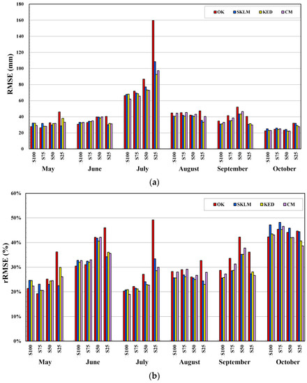 The error statistics per month were further analyzed to investigate the monthly variations in such statistics based on different kriging algorithms. rME did not show any interpretable patterns for each month. Comparing the monthly variations in the RMSEs with different kriging algorithms (Figure 7a), the RMSE was highest in July with a relatively large amount of precipitation. The OK prediction for July had the highest RMSE of 159.7 mm. As the density of the rain gauges decreased, the RMSE of OK increased for all months. By contrast, the three multivariate kriging algorithms had similar or lower RMSEs compared with OK as the density of rain gauges decreased. In particular, for S25, integration with the TRMM precipitation product improved the RMSE compared with OK.