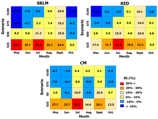 The relative improvements in the RMSE over OK are presented as a contingency table plot in Figure 8, where the blue color denotes that the RMSEs of the multivariate kriging algorithms are higher than that for OK, thereby implying its poor predictive performance. When a large number of rain gauges was used for integration with the TRMM data (i.e., S100), no significant improvements in the predictive performance could be obtained. In some months such as May, integration with the TRMM data led to even larger errors compared with OK. As the density of rain gauges decreased, however, the contribution of the TRMM data increased and led to significant improvements in the predictive performance for all months. All three integration algorithms performed better than OK with S50 and S25, except for August and September. The largest improvement in the RMSE was obtained in most months with S25, except for October. This result confirms that the contribution of TRMM precipitation is the greatest when fewer rain gauges are used. A comparison of the predictive performance of the three integration algorithms showed that SKLM improved the RMSE most for May (37.9%), as well as KED for June (41.9%) and CM for September (26.1%). The relatively lower improvement in the RMSE for October might be explained by the errors in TRMM precipitation product. As shown in Table 1, the rRMSE of TRMM was highest in October. Thus, the integration with the TRMM precipitation product containing errors led to no significant improvements in the RMSE when fewer rain gauges were used. According to the three error statistics, the predictive performance when integrating the TRMM precipitation product with rain gauge data depends greatly on the density of rain gauges. Thus, the integration of TRMM precipitation data is only beneficial when the number of available rain gauges is relatively small.
