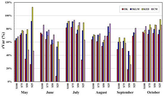 The variations of rVar that measures the degree of smoothness for predictions are shown in Figure 9. The smoothing effect of OK increased dramatically as the density of rain gauges decreased in all months. By contrast, integrating TRMM precipitation data using multivariate kriging greatly reduced the smoothing effect. In some months such as May, September and October, the rVar value increased for KED although a very small number of rain gauges was used (S25). A comparison of the multivariate kriging algorithms showed that KED had larger rVar values for most months and densities compared with SKLM and CM. When considering all of the RMSE, rRMSE and rVar, it is confirmed again that the benefit of using TRMM precipitation data is most apparent as the density of rain gauges decreases.