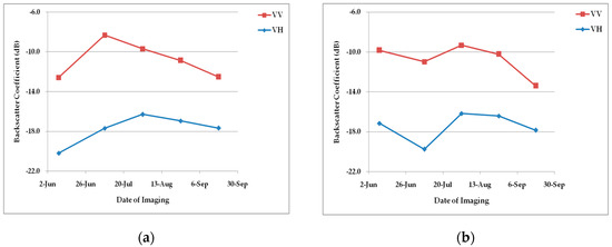 Temporal backscatter profiles of Rice subclasses at both polarizations: (a) Rice A; (b) Rice B. Data points correspond to Sentinel-1A images of Shanghai acquired on 9 June, 8 July, 1 August, 25 August and 18 September in 2015, respectively.