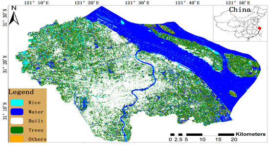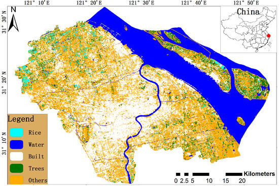 In Table 5, even though almost all validation points of Rice have been correctly classified, there are some commission errors in this class. Much of the commission errors in Water are derived from the misclassification of Rice. In addition, much of the omission errors in the class “Others” are derived from the misclassification of Trees. Built shows a relatively good agreement with ground reference data.