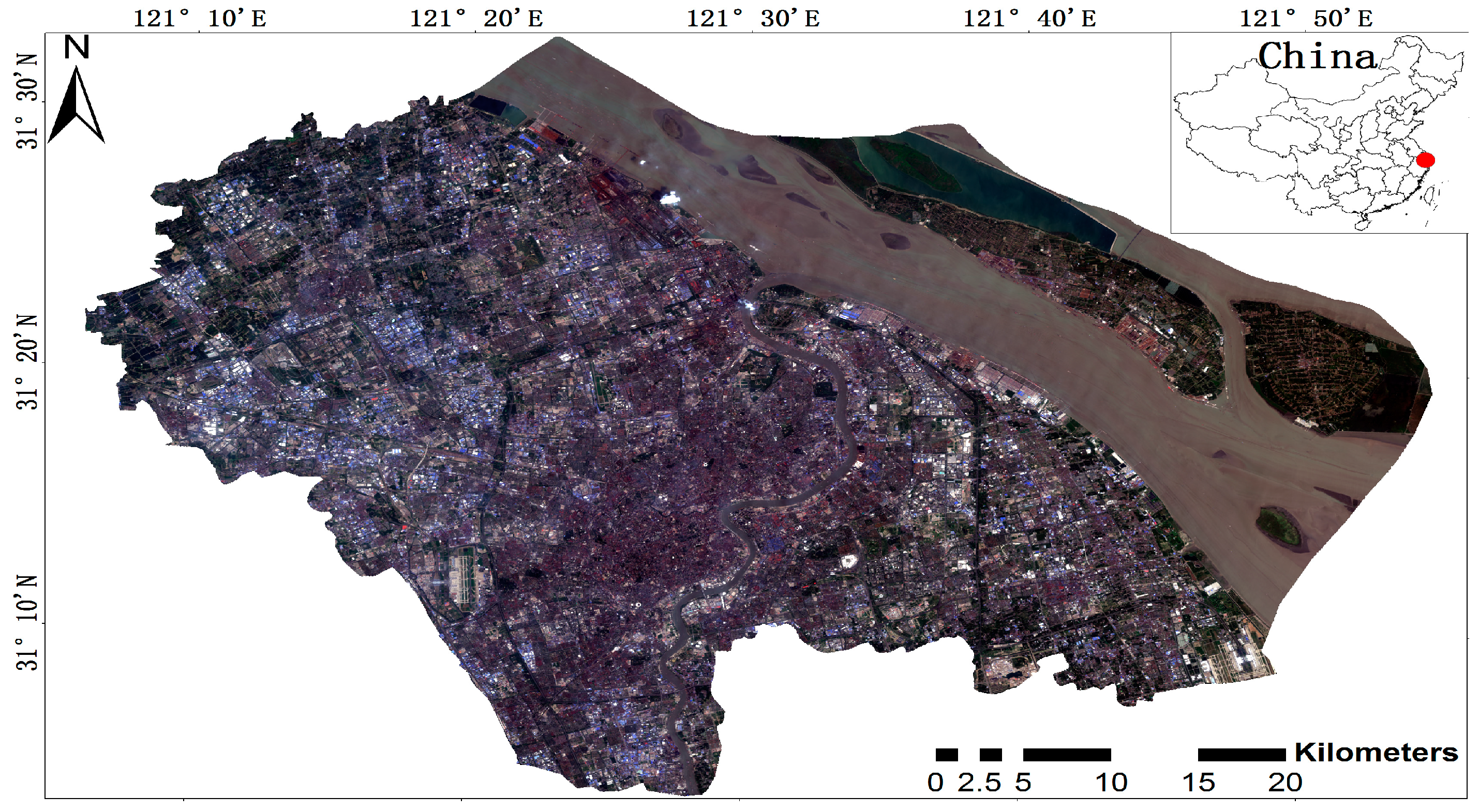 2, and is centered at longitude 121°5′0.9′′E and latitude 31°8′5.8′′N. It is the most densely populated and most economically intensive part in the Shanghai metropolitan area. The location map of this area is given in
