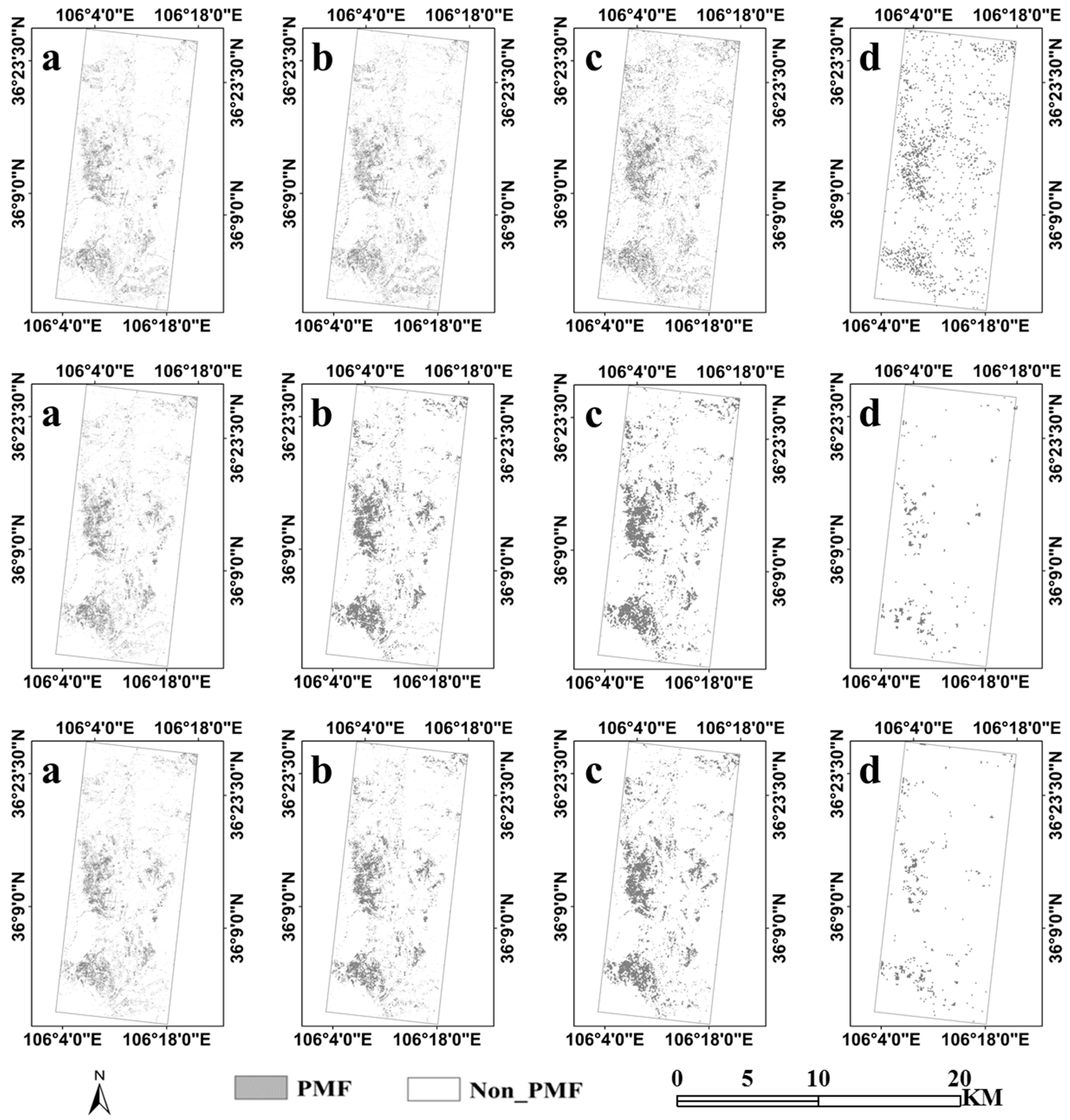 Figure 8, taking PMF generated from the different feature sets with spatial resolutions of 6 m, 64 m, 100 m and 250 m as examples. We can observe that most of the PMF in Guyuan, Ningxia, were dispersed across whole regions. There are significant differences between feature sets over the varying spatial resolution. At the spatial resolution of 64 m and 100 m, the distribution area of PMF was larger than that from the finer resolution imagery due to the greater commission error resulting from mixed pixels and blurred structural information. Furthermore, at the spatial resolution of 250 m, the PMF is almost undetectable, particularly when using the textural or combined spectral and textural features.