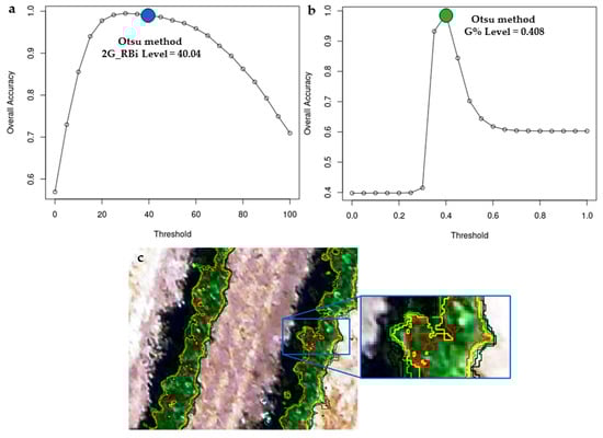 Example of the comparison between overall accuracy and threshold values for Spectral indices. (a) Difference index (2G_RBi); (b) Green percentage index (G%) and (c) Visual interpretation of thresholding process of 2G_RBi for Plant class. Values below 40 are shown in black, equal to 40 in green, 50 in yellow and 60 in red.