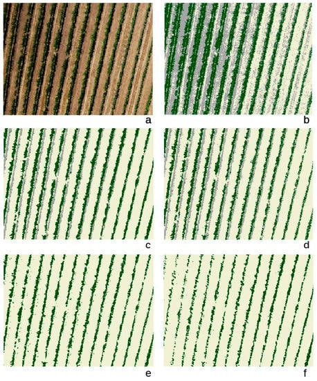 Classification results for the different methods using R, G, B channels and the spectral indices as input data. In green plant class, beige: soil class and dark gray: shadow class. (a) original image; (b) K-means.ex; (c) ANN.ex; (d) RForest.ex; (e) G% and (f) 2G_RBi.