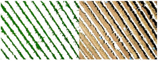 When compared with piloted aircraft, UAVs provide a much safer and cost-efficient means of data acquisition. Furthermore, the vineyards can be frequently surveyed to study ongoing phenomena at different phenological stages. Recent studies have demonstrated that high-resolution RGB images obtained by low-cost cameras can be used to monitor spatial variability of vine biophysical parameters [15,16]. Nevertheless, for an accurate evaluation of vineyard attributes from very high-resolution RGB imagery, automated procedures are required to rapidly extract the information coming from the vegetation (vine canopy pixels). Within-vineyard images contain different ground covers other than grapevines, i.e., ground vegetation, wood, shadows, etc. [14]. Therefore, for the construction of accurate vineyard maps, all non-vine row vegetation needs to be identified and removed to aid in the accurate estimation of plant biophysical parameters [9,14,17].